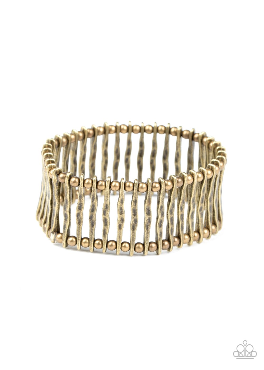 Separated by dainty brass beads, hammered brass bars are threaded along stretchy bands around the wrist for an edgy rustic display.