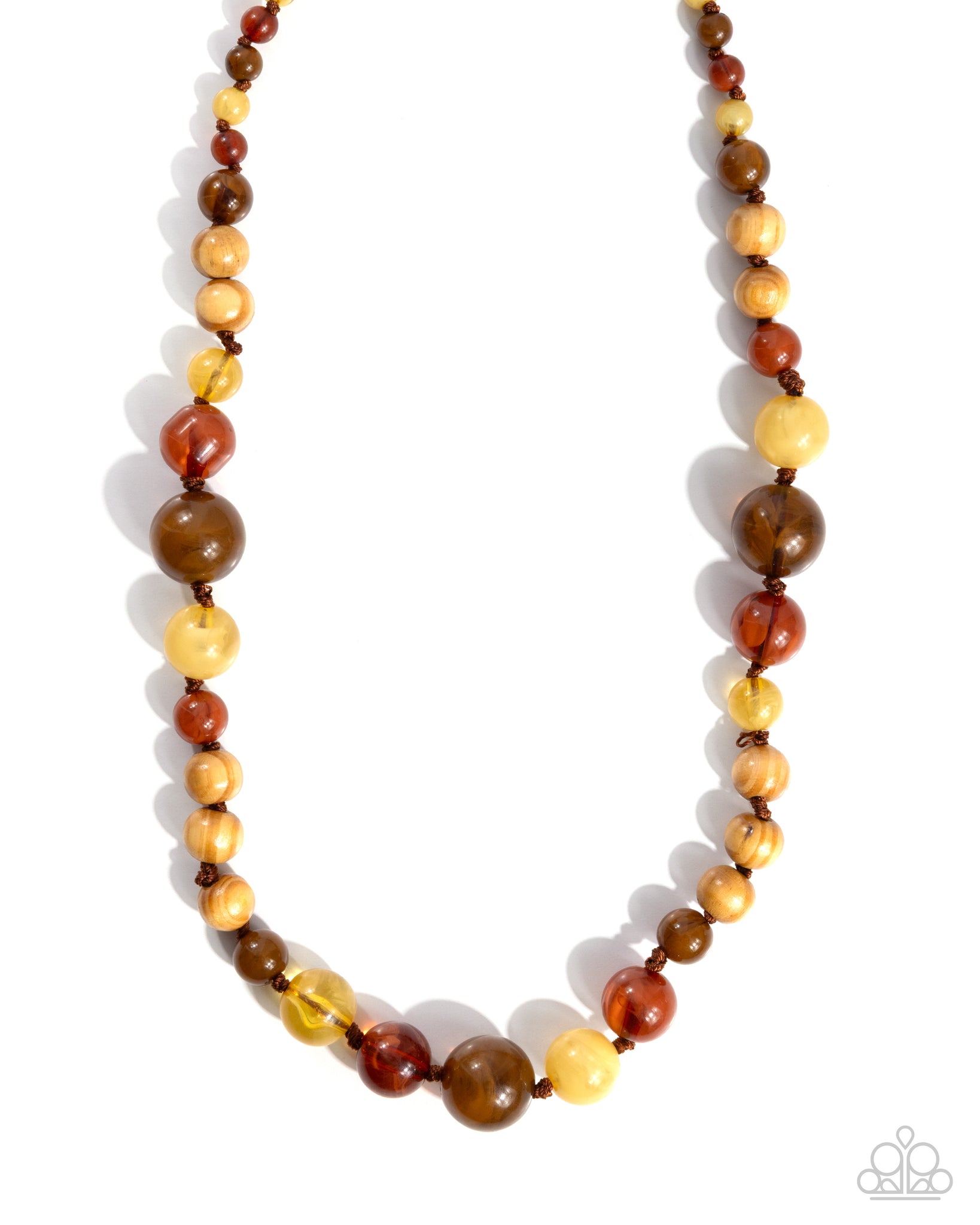 Infused along barely visible brown string, a collection of milky Lemon Grass, red, and brown beads joins light brown wooden beads along the neckline in a radically rustic pattern. Features an adjustable clasp closure.