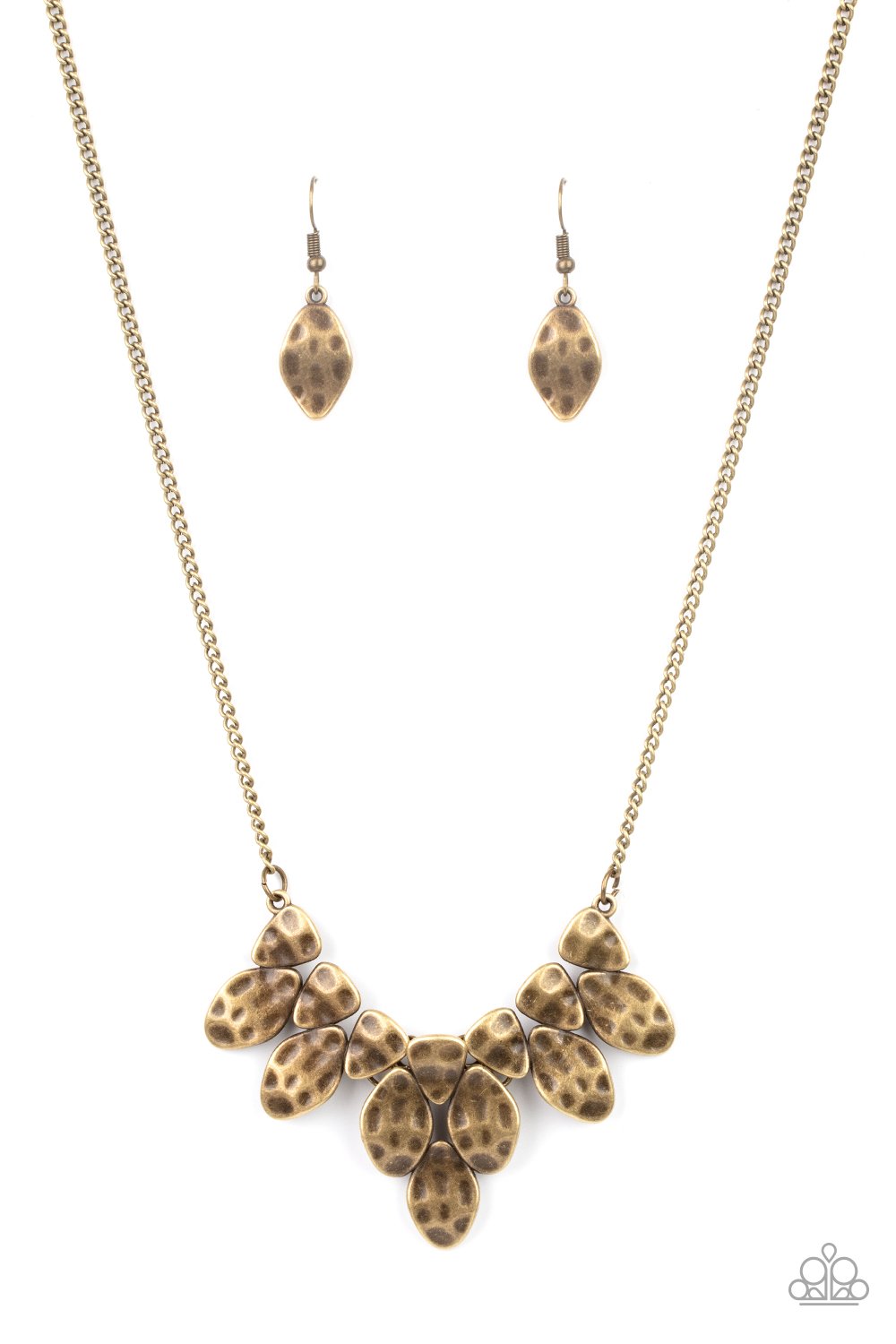Hammered in a rustic shimmer, a collection of asymmetrical brass frames connect into an abstract plate below the collar. Features an adjustable clasp closure.