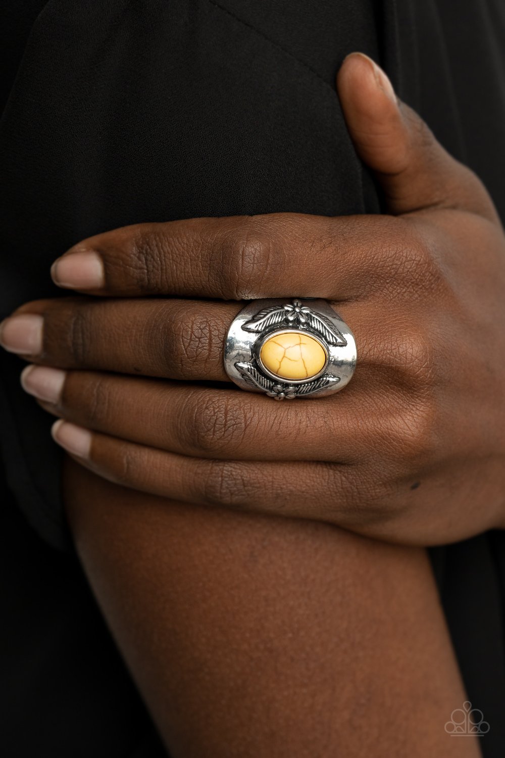 Flanked with leafy floral accents, an oval yellow stone dots the center of a rustic silver plate that folds around the finger for a simply seasonal look. Features a stretchy band for a flexible fit.