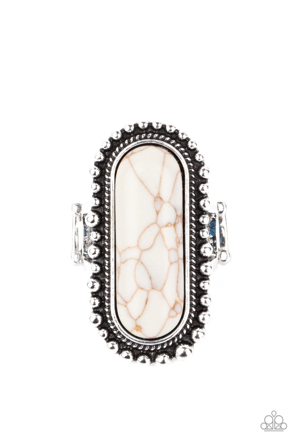 An oblong white stone is nestled inside an oversized studded silver frame, creating a colorfully rustic centerpiece atop the finger. Features a stretchy band for a flexible fit.