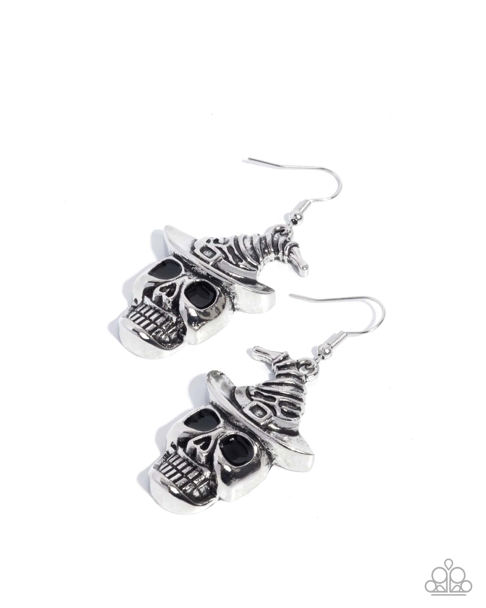 Topped with a detailed, textured witch's hat, a glistening silver skeleton head complete with black-painted eyes and a wide grin sways from the ear for a spooky, Halloween-inspired lure. Earring attaches to a standard fishhook fitting.