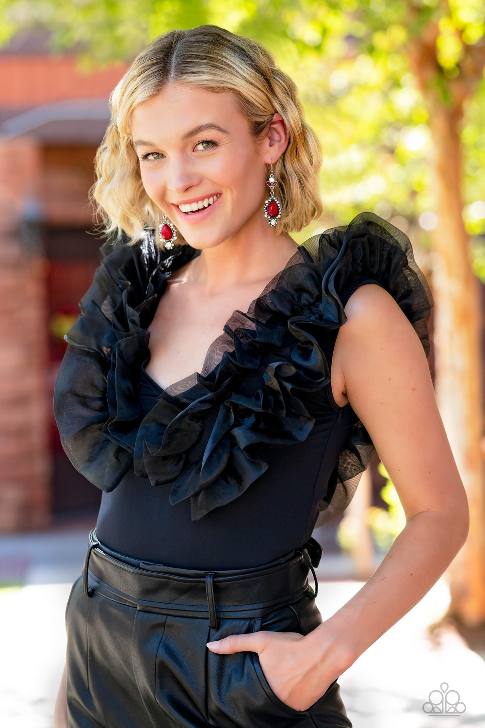 Dotted with dainty white rhinestones, leafy silver frames bloom from an oversized red teardrop bead that delicately hangs from a leafy white rhinestone and red beaded fitting for a whimsical finish. Earring attaches to a standard fishhook fitting.