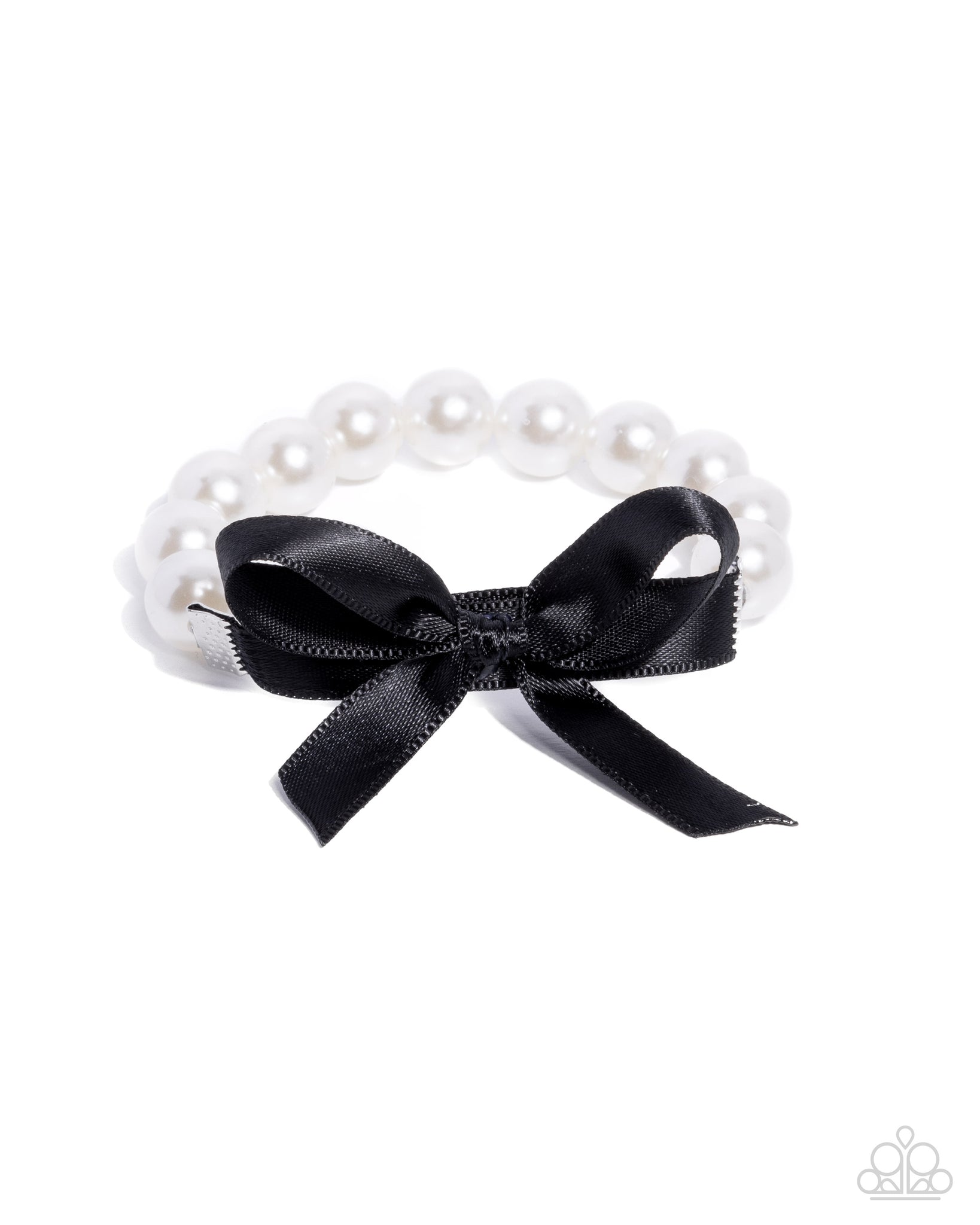 Delicately gathered and tied into a bow, a black satin ribbon connects to a glistening strand of white pearls infused along an invisible stretchy string along the wrist for a preppy display.