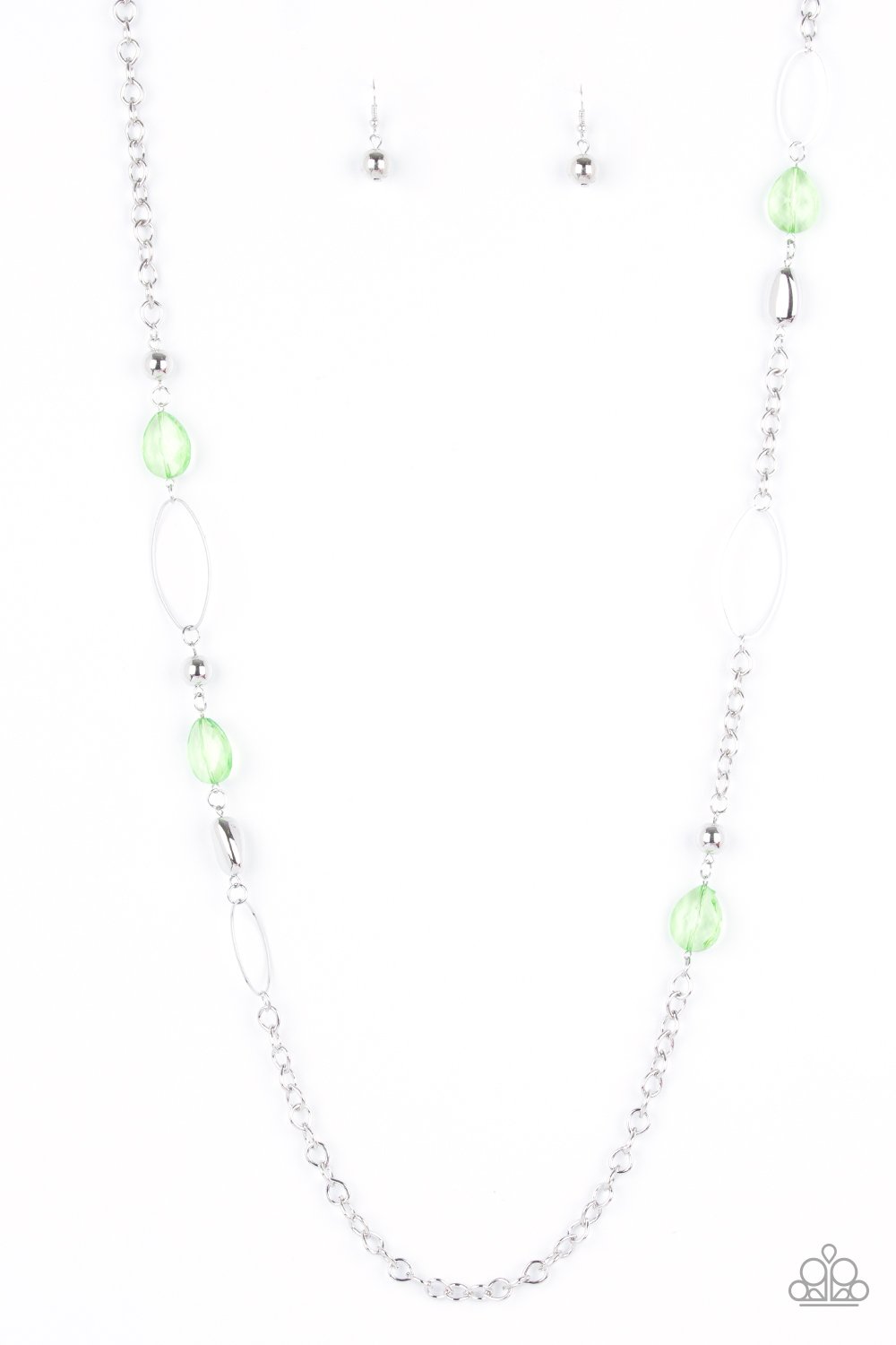 Faceted Apple Green teardrop beads, dainty oval hoops, and silver accent beads descend along a silver chain in a whimsical pattern. Features an adjustable clasp closure.