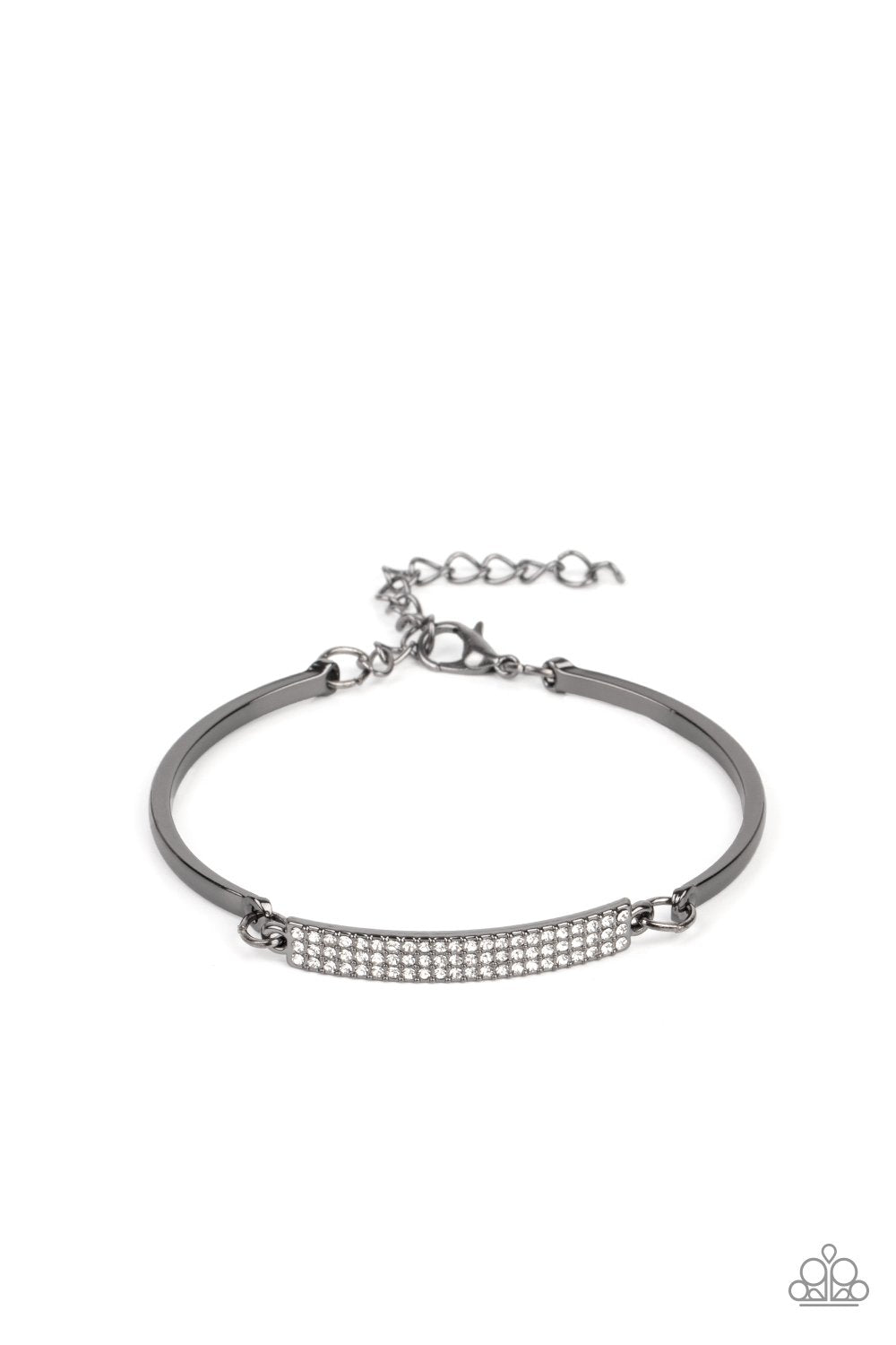 Two arcing gunmetal bands link with a gunmetal frame encrusted in row after row of glassy white rhinestones, creating a sparkly centerpiece around the wrist. Features an adjustable clasp closure.