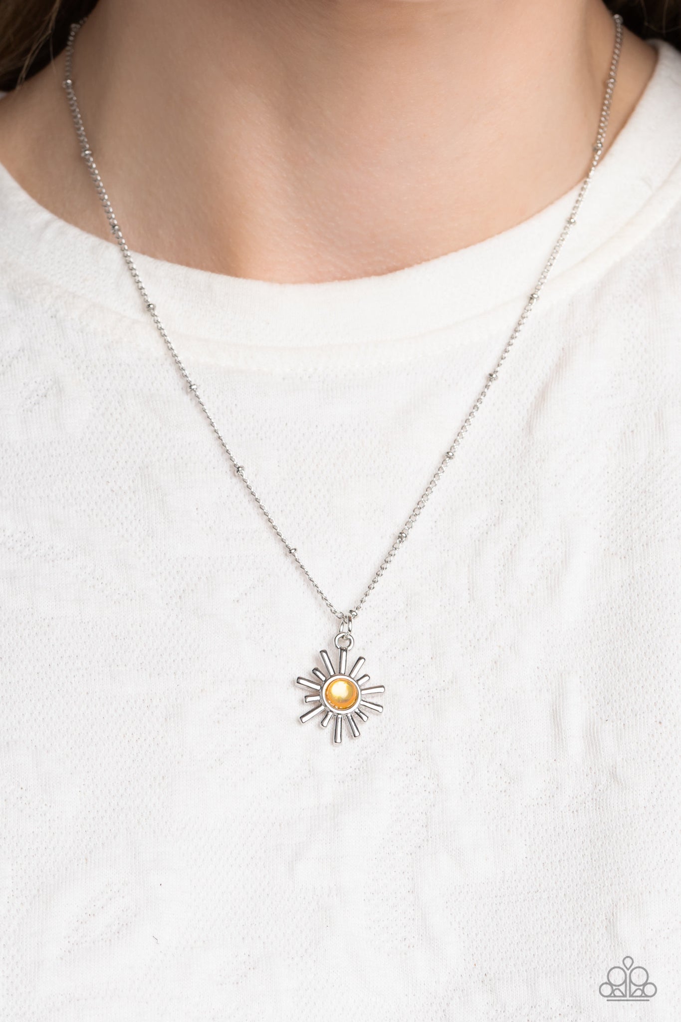 Dainty silver bars in varying sizes radiate from a glassy round yellow bead center, creating a sunny pendant down the neckline. Infused along the dainty silver chain, dainty silver studs bring additional subtle texture to the warm design. Features an adjustable clasp closure.