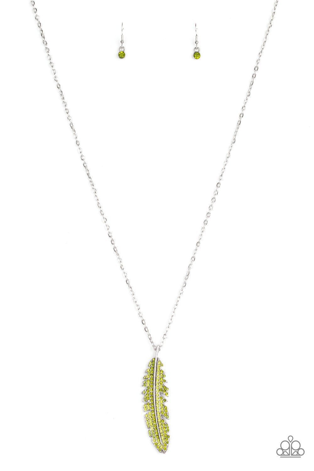 Encrusted in glittery green rhinestones, a lifelike silver feather pendant swings at the bottom of a lengthened silver chain for a wanderlust sparkle. Features an adjustable clasp closure.