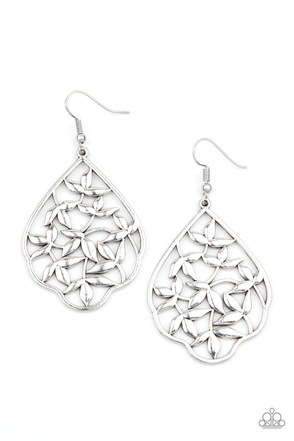 Leafy silver filigree climbs the center of a scalloped silver frame, creating a whimsically seasonal display. Earring attaches to a standard fishhook fitting.