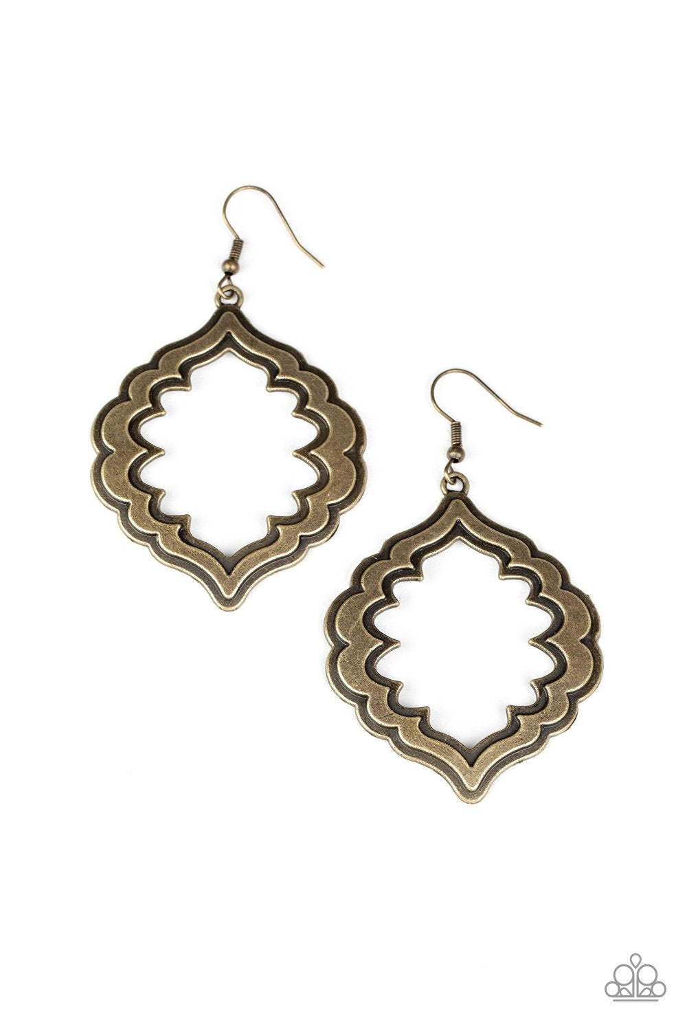 Brushed in an antiqued shimmer, a gorgeously scalloped brass frame swings from the ear for a whimsical look. Earring attaches to a standard fishhook fitting.