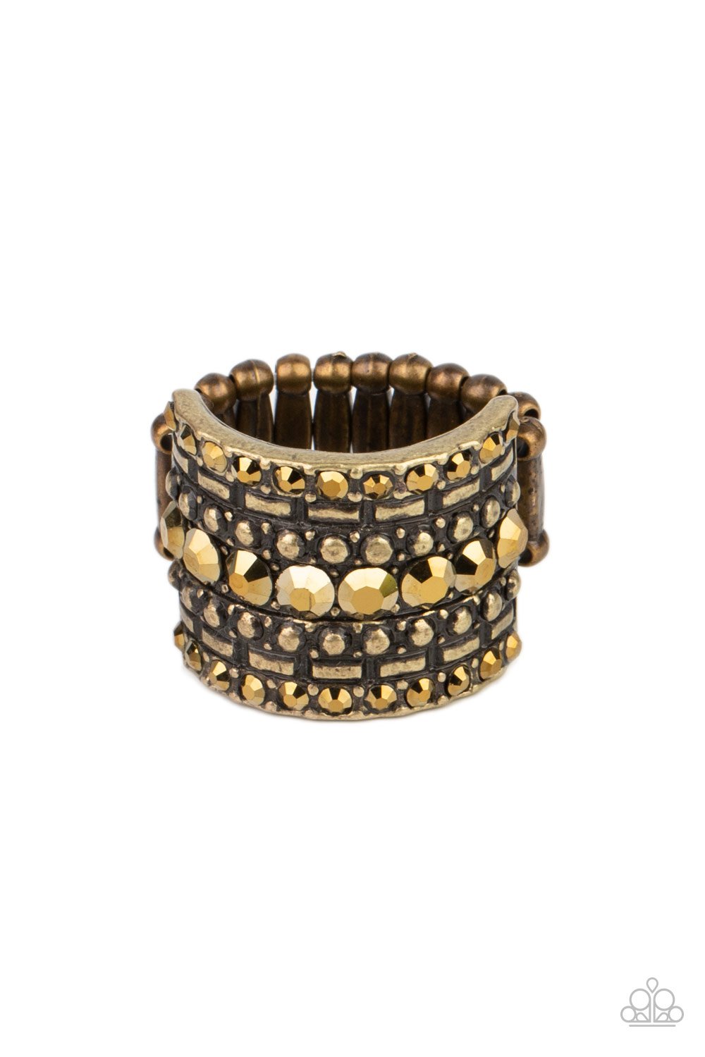 Layers of linear brass textures are accented with a single row of aurum rhinestones, adding a touch of glam to the gritty design. Features a stretchy band for a flexible fit.