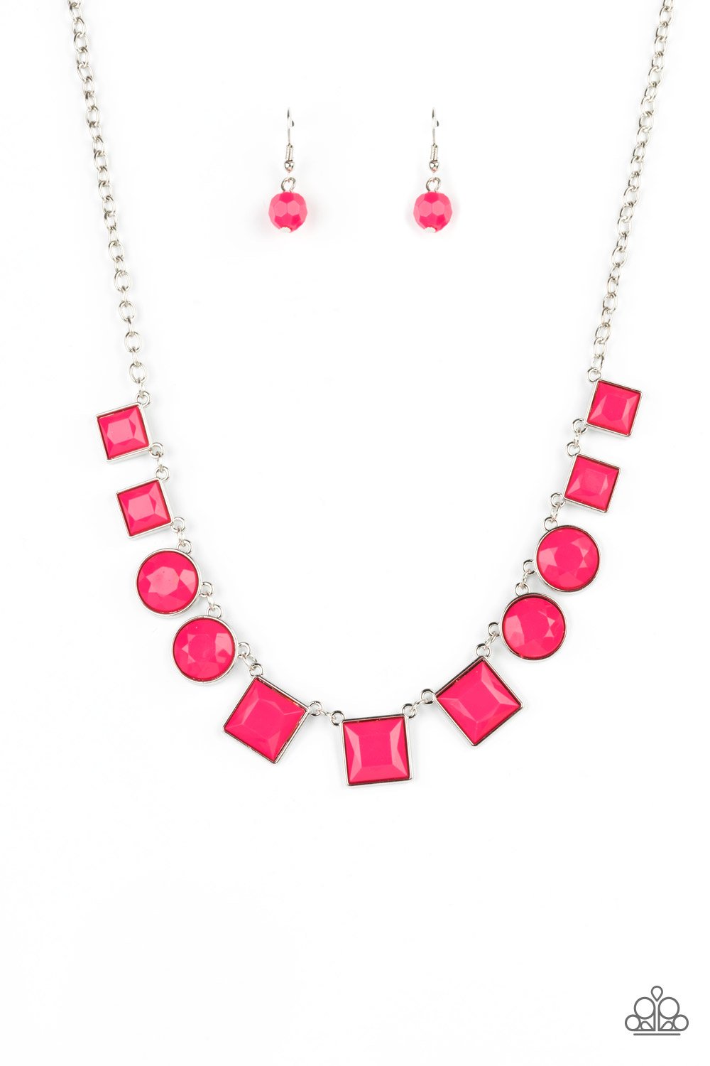 Bright geometric square and round beads in the Pantone® of Raspberry Sorbet are pressed into simple silver frames to create a lively statement below the collar. Features an adjustable clasp closure.