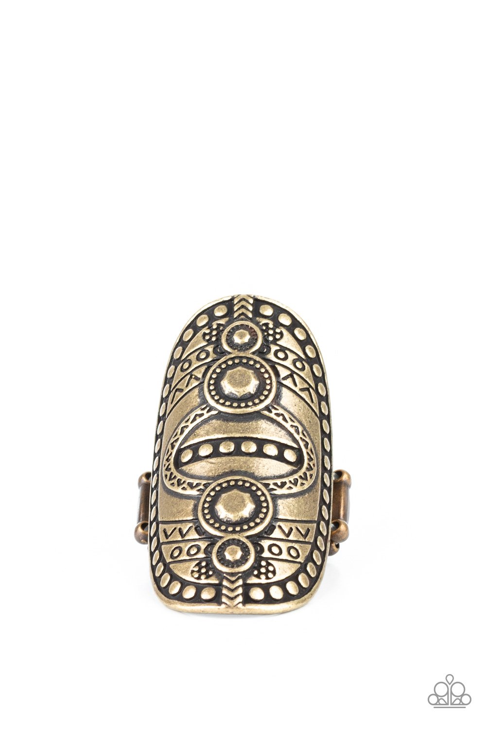Studded and stamped in tribal inspired textures, an oversized brass frame folds around the finger for a rustically authentic look. Features a stretchy band for a flexible fit.