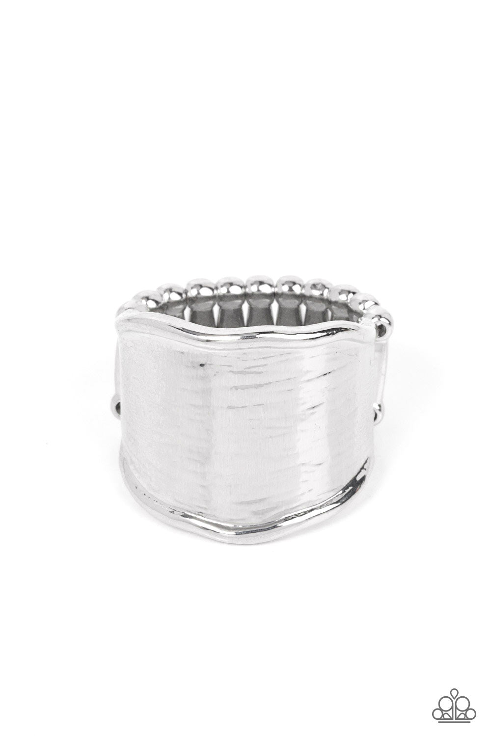 Wavy silver bars border a flattened silver frame that is etched in glistening details, resulting in a reflective shimmer around the finger. Features a stretchy band for a flexible fit.