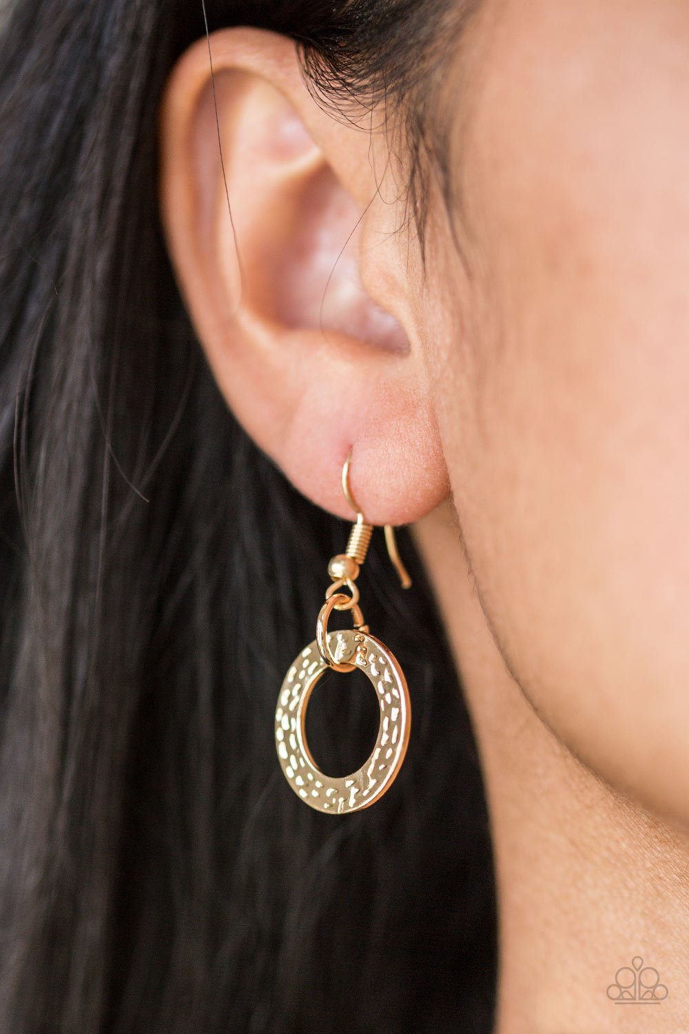 Brushed in a high-sheen shimmer, delicately hammered gold discs connect below the collar for a bold industrial look. Features an adjustable clasp closure.