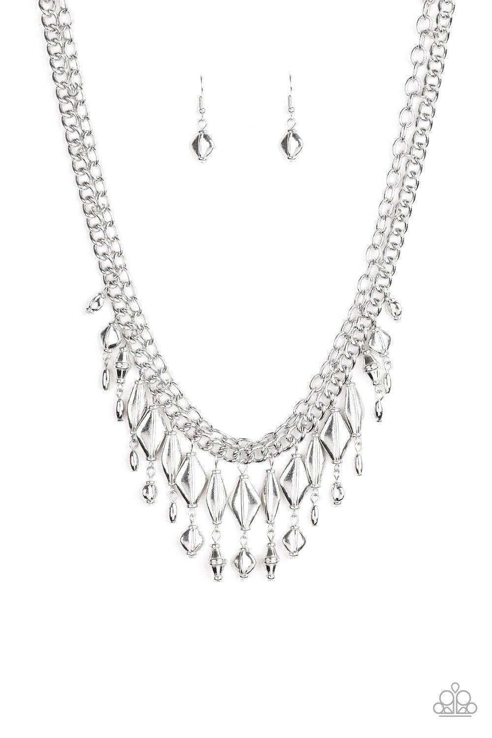 A mismatched collection of silver beaded tassels dangle from the bottom of two interconnecting silver chains, creating a noisy fringe below the collar. Features an adjustable clasp closure.