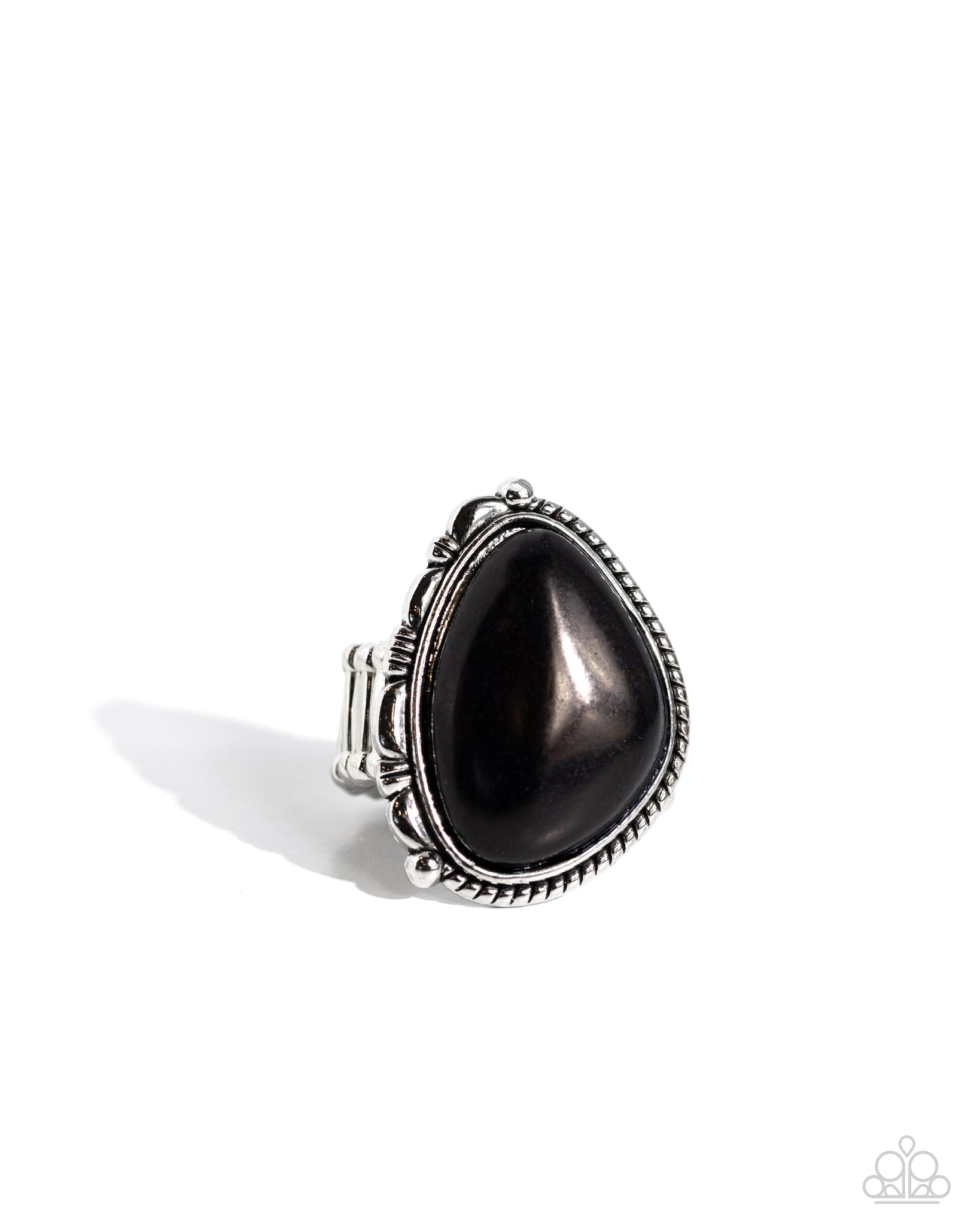 An asymmetrical black stone is pressed into an abstract silver frame studded and textured in rustic silver details, creating a seasonal centerpiece atop the finger. Features a stretchy band for a flexible fit.