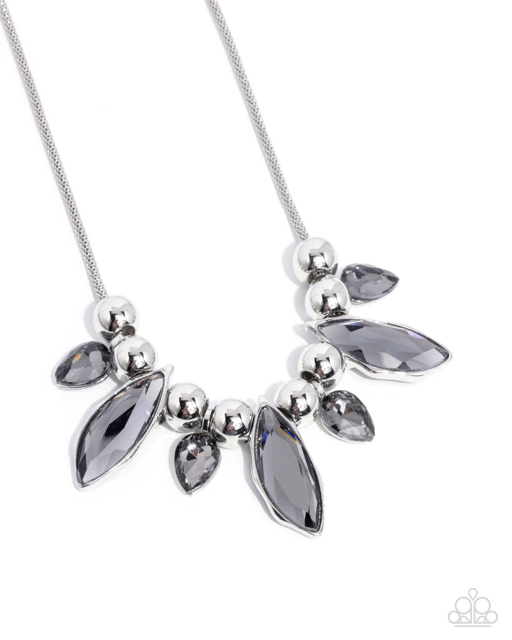 Infused along a silver mesh chain, a collection of oversized glossy silver beads are interrupted by upside-down teardrop smoky gems and oversized chiseled smoky gems in abstract silver fittings, for a trenchant, edgy display. Features an adjustable clasp closure.