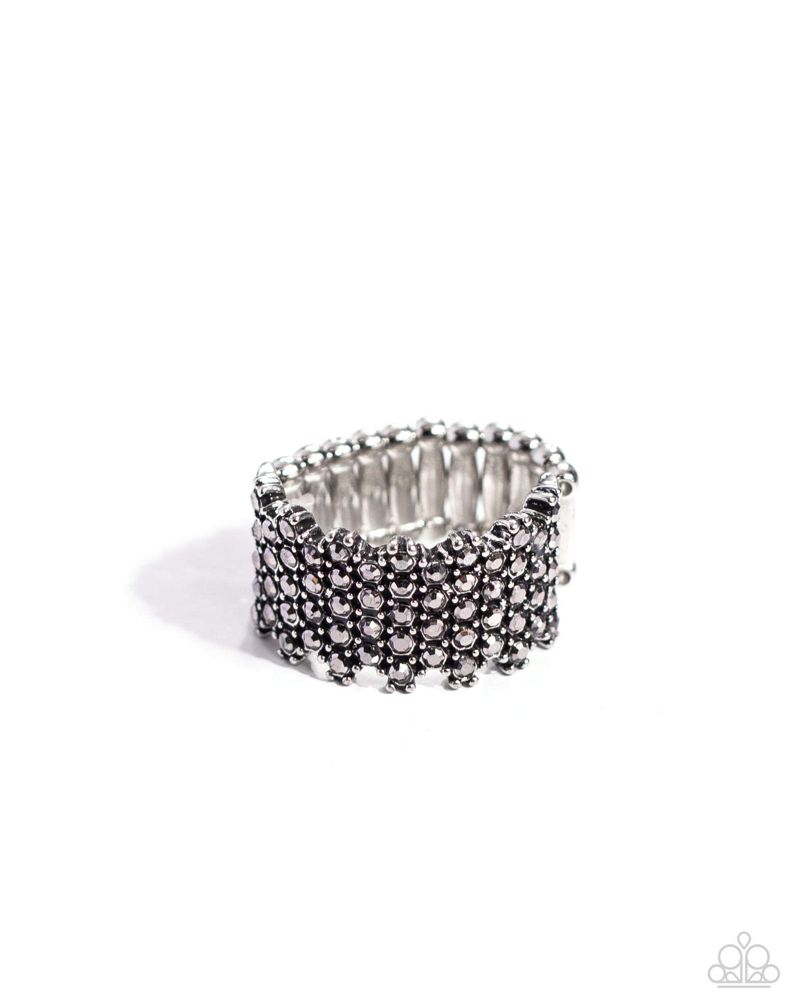 Row after row of blinding hematite rhinestones are vertically stacked across a pronged silver band for an edgy, dramatic look. Features a stretchy band for a flexible fit.