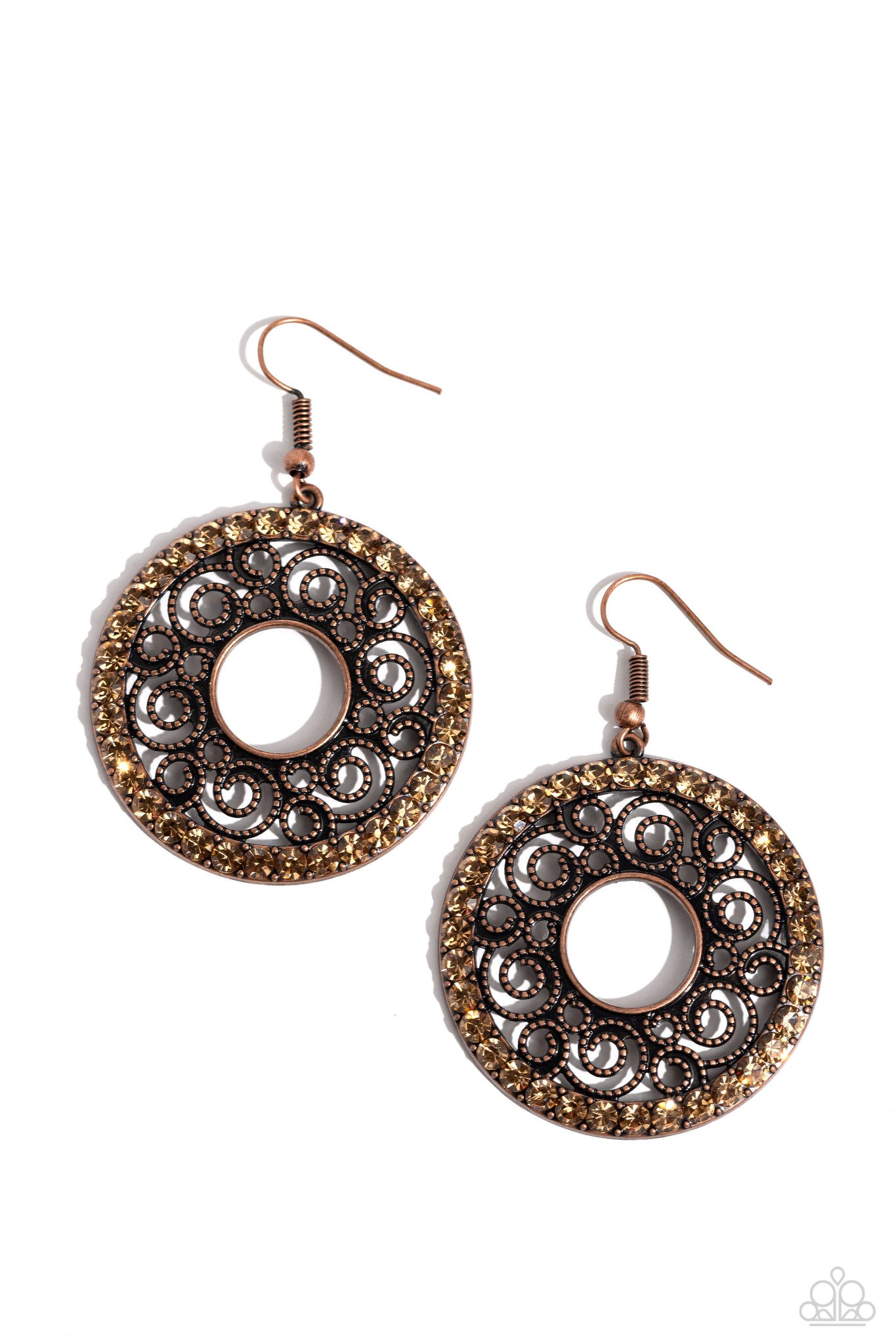 Bordered in a ring of golden topaz rhinestones, a rustic copper hoop is filled with whirly copper filigree for a wistful finish. Earring attaches to a standard fishhook fitting.