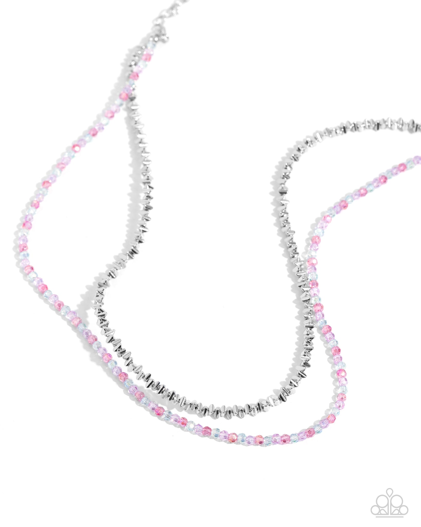 A strand of chiseled silver beads layers beside a faceted collection of multicolored beads for a girly display. Features an adjustable clasp closure.