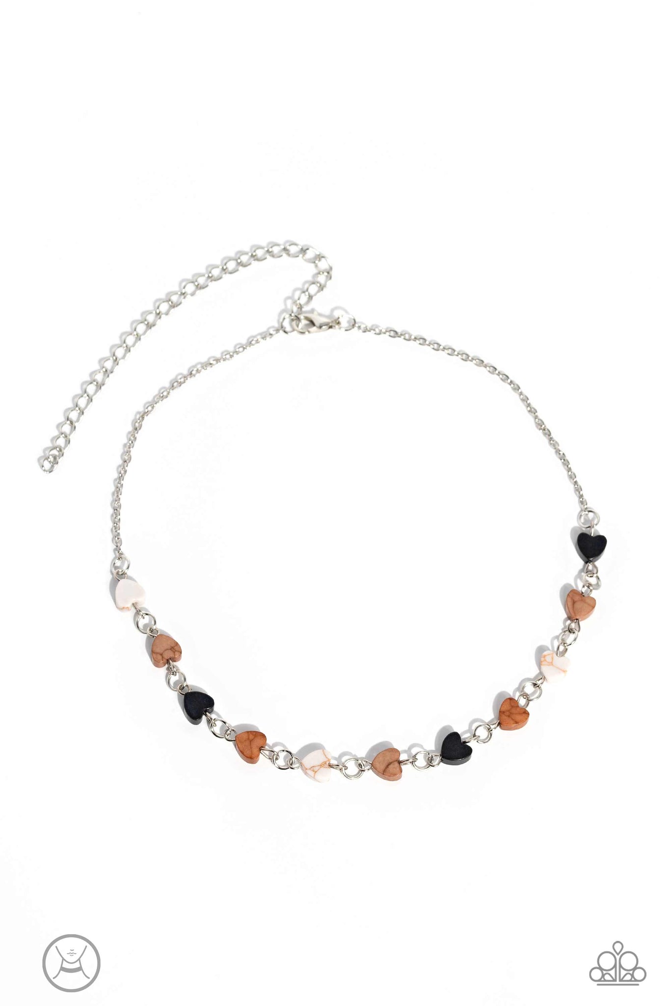 Heart-shaped stones in shades of Macchiato, brown, black, and white dances along a dainty, shimmery silver chain below the collar for a romantic finish. Features an adjustable clasp closure. As the stone elements in this piece are natural, some color variation is normal.