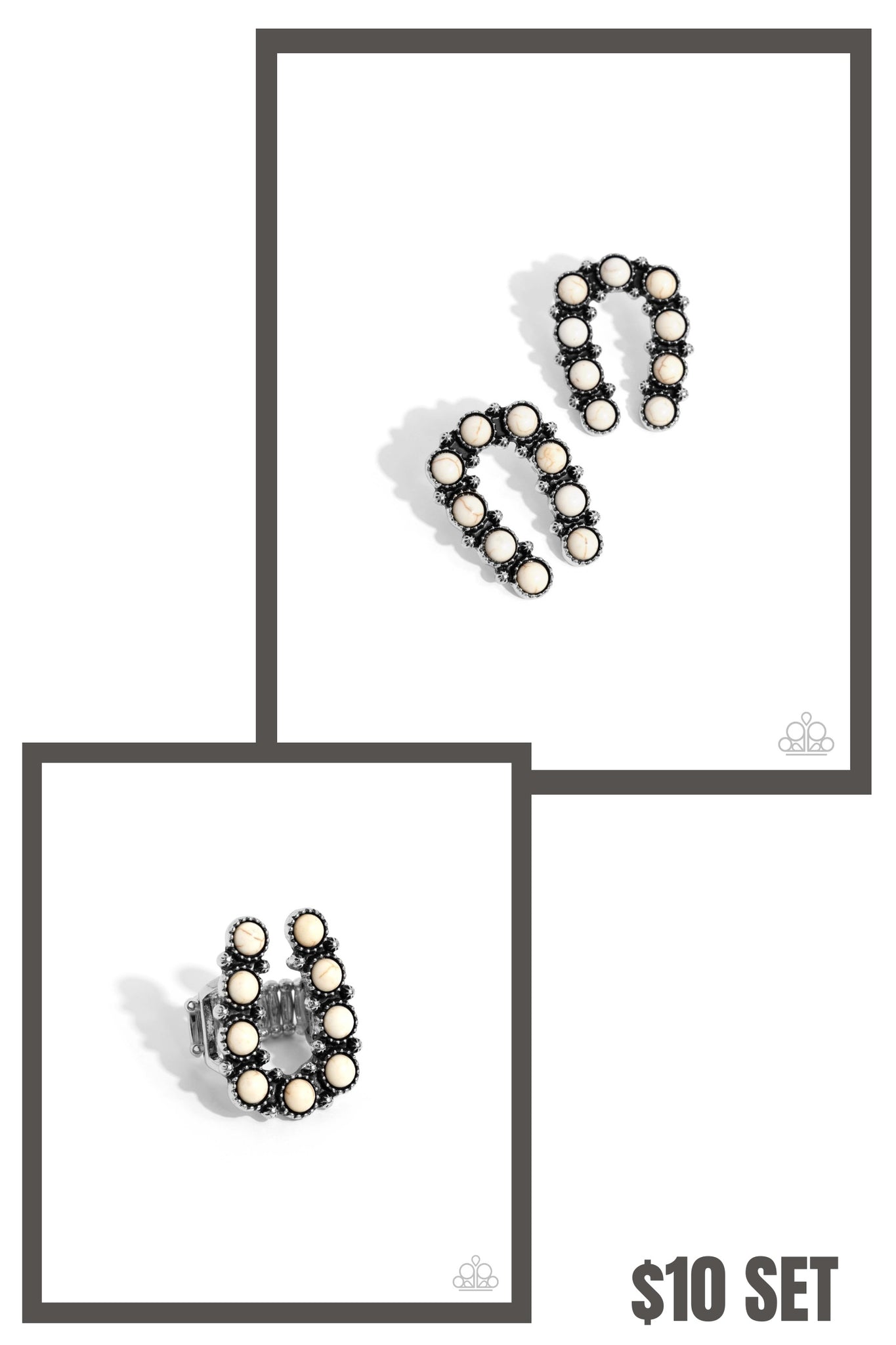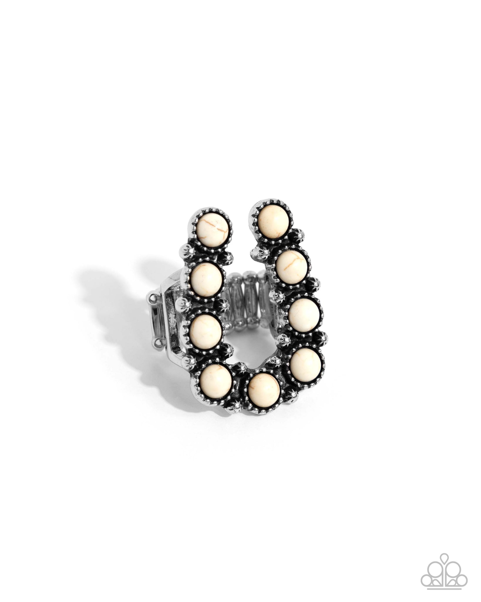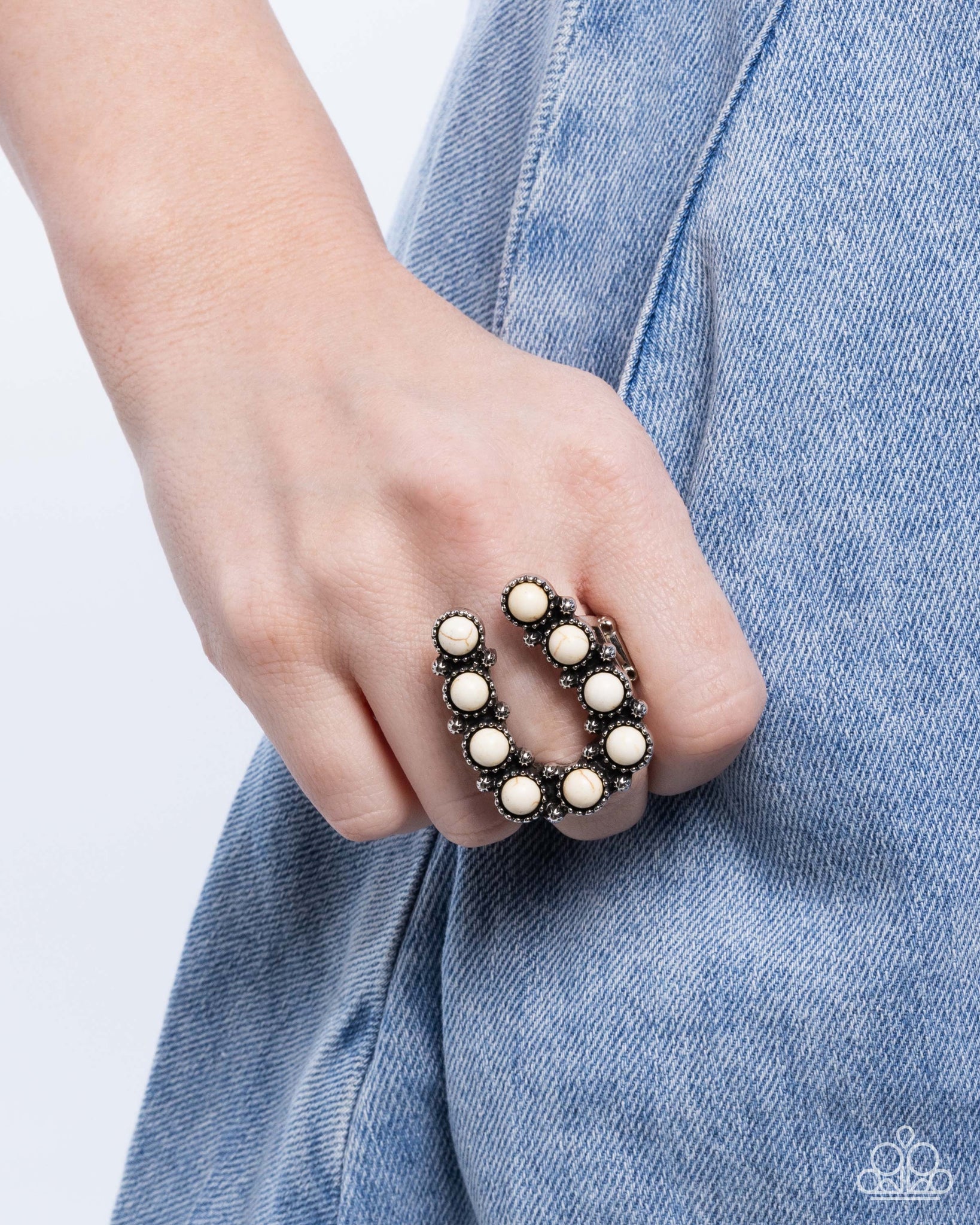 RING: Wild West Whisper • White P4SE-WTXX-207DS: Embellished with white stones pressed in flared silver fittings and silver-studded details, an oversized silver horseshoe hangs upside down atop the finger on airy silver bands for an eye-catching Wild West display. Features a stretchy band for a flexible fit. As the stone elements in this piece are natural, some color variation is normal.