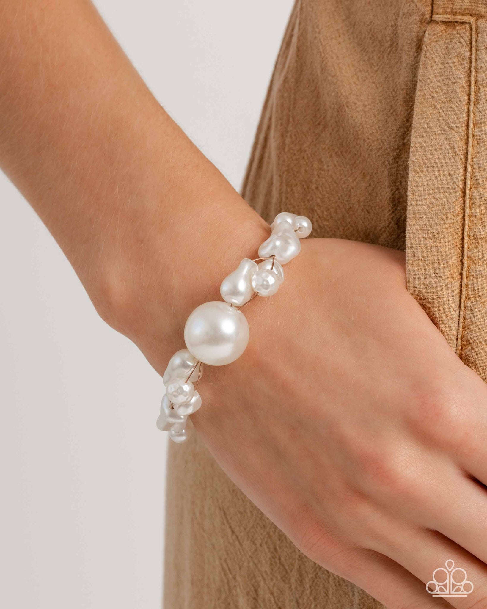 BRACELET: Wiry Wish • Copper P9RE-CPXX-139HA: Infused along a trio of dainty copper wires, a collection of classic and baroque white pearls in varying sizes coalesce around the wrist, leading the eye to an oversized round white pearl for an opulent, refined centerpiece. Features an adjustable clasp closure.