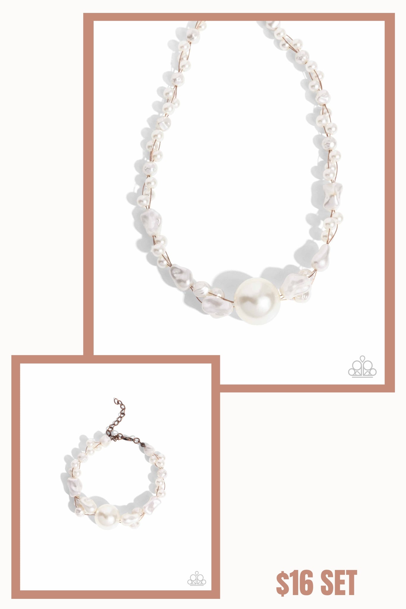 NECKLACE: Wiry Wonder • Copper P2RE-CPXX-256HA: Infused along a trio of dainty copper wires, a collection of classic and baroque white pearls in varying sizes coalesce around the collar, leading the eye to an oversized round white pearl for an opulent, refined display. Features an adjustable clasp closure.