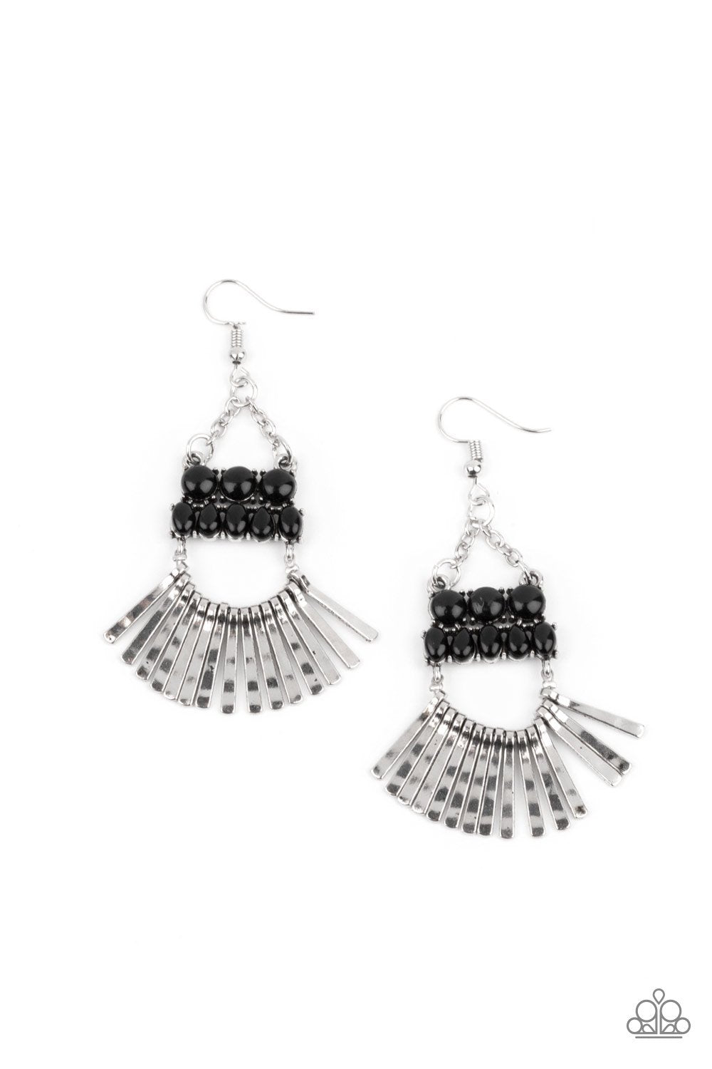 A row of delicately hammered silver rods fans out along a dainty silver wire that attaches to the bottom of stacked rows of shining black beads. The mismatched rows of beads swing from the bottom of dainty silver chains, coalescing into an ethereally rustic chandelier. Earring attaches to a standard fishhook fitting.