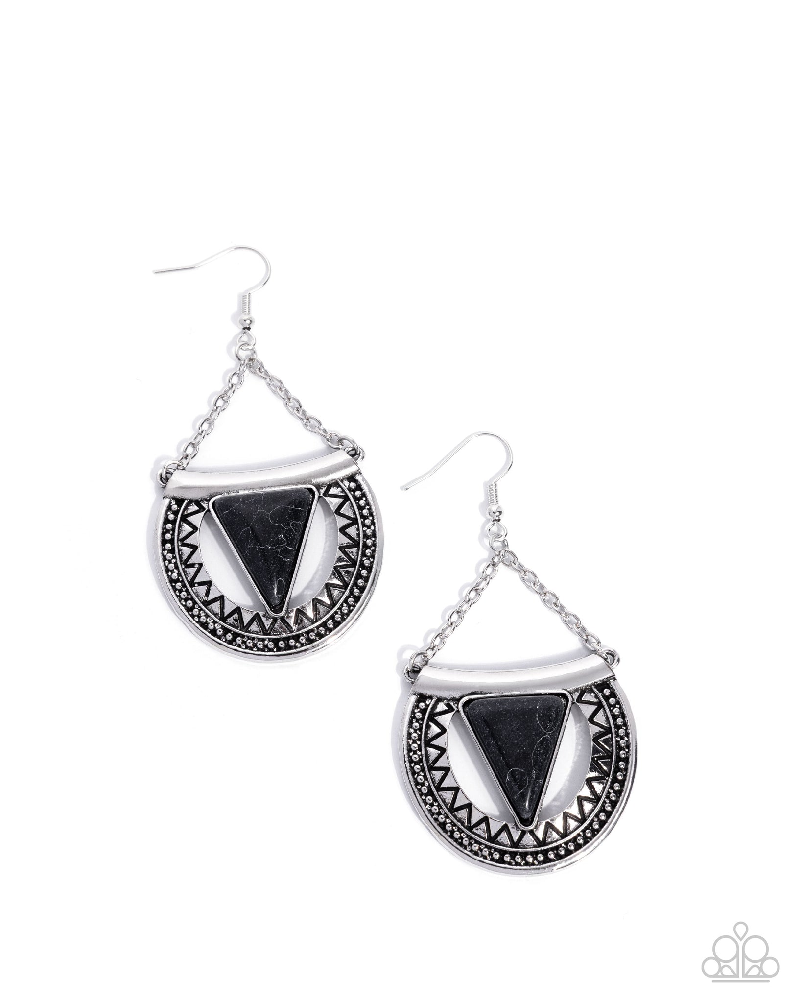 Suspended by a pair of dainty silver chains, a stamped crescent frame showcases a triangular marbled black stone. Zigzagging patterns and studded details border the circular frame for a bold, southwestern-inspired statement. Earring attaches to a standard fishhook fitting. As the stone elements in this piece are natural, some color variation is normal.