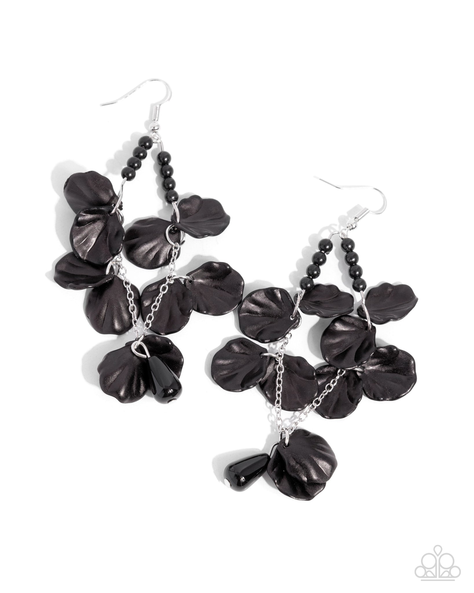Infused along a dainty silver arch, a quartet of dainty black pearl beads frames both sides of the ear, giving way to a collection of pearly black seashells that sway and cascade below the ear to a solitaire black teardrop bead for a monochromatic coastal-inspired look. Earring attaches to a standard fishhook fitting.