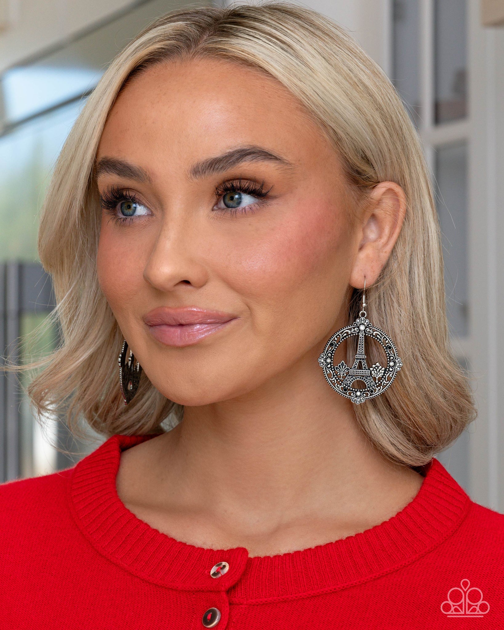 Dusted in black, smoky, and white rhinestones, an intricately detailed Parisian-inspired scene, complete with the Eiffel Tower, stands at the center of a floral filigree-filled circular silver frame below the ear for a polished, poised display. Earring attaches to a standard fishhook fitting.