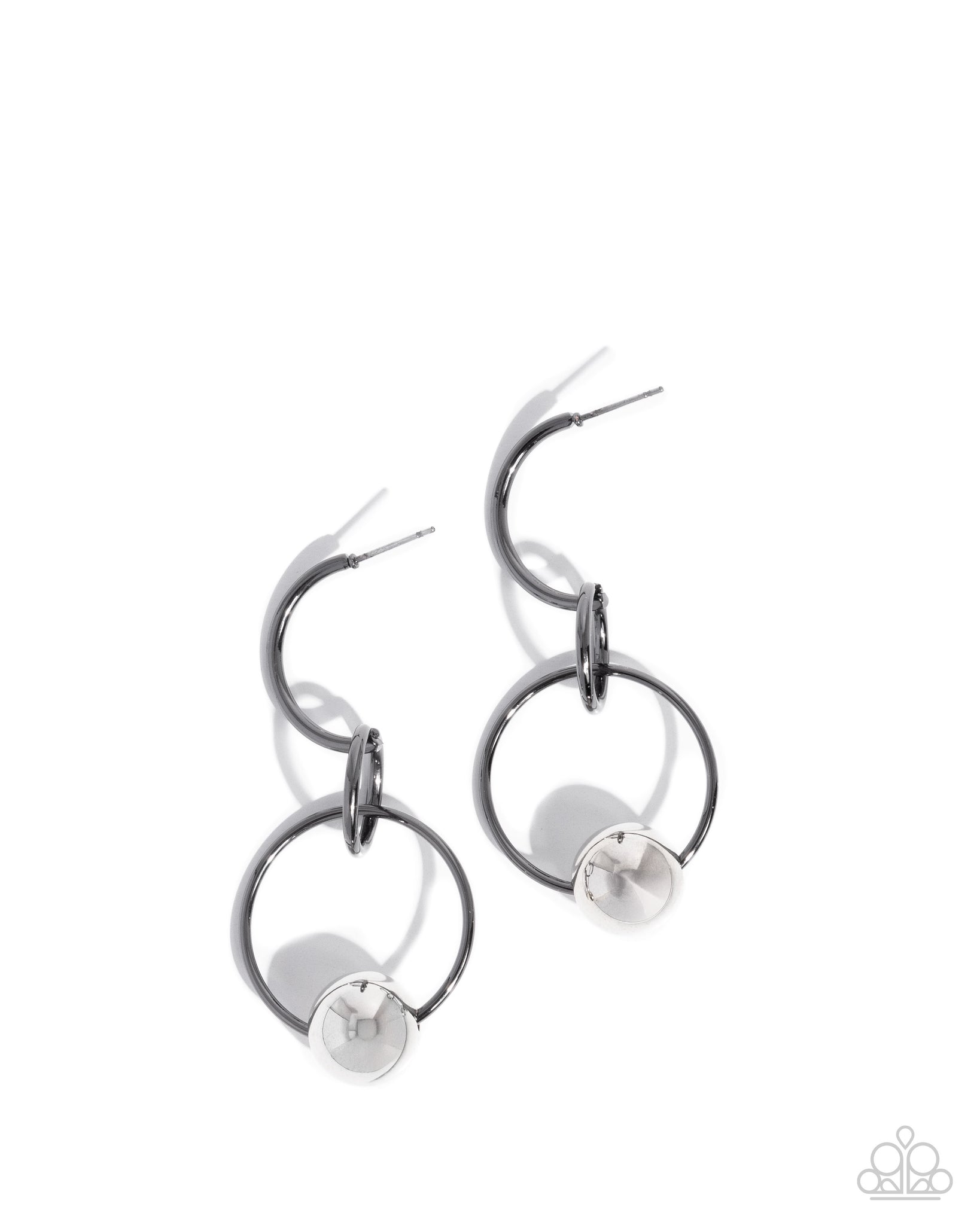 Interconnected gunmetal links tumble from the bottom curve of a gunmetal hoop, highlighting the silver bead infused along the lowermost hoop for an edgy elongated lure. Earring attaches to a standard post fitting. Hoop measures approximately 3/4" in diameter.