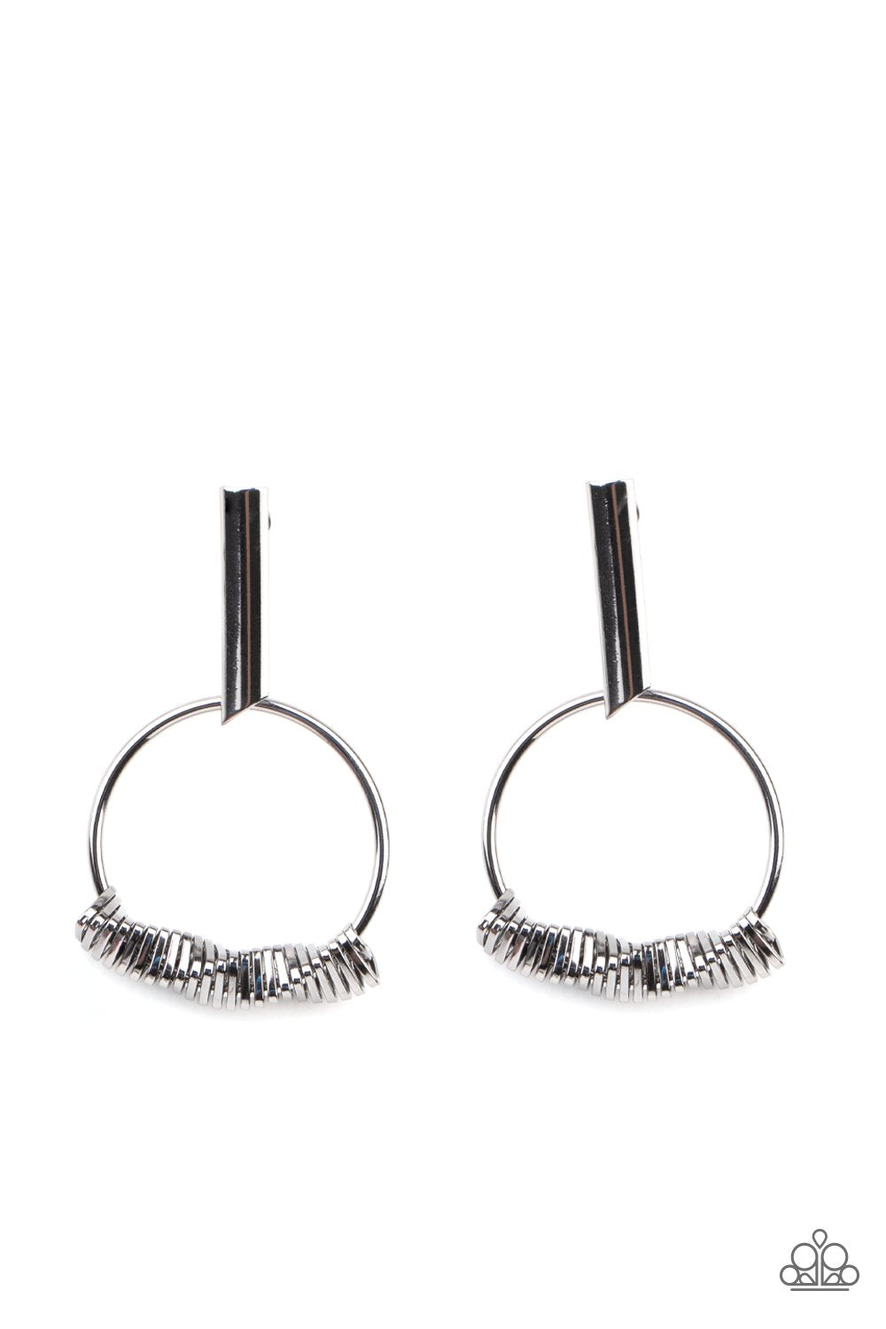 Glistening gunmetal triangular rings are delicately fitted in place along the bottom of a dainty gunmetal hoop, creating the illusion of twisting movement. The edgy hoop links to a gunmetal rectangular hoop, creating an edgy lure. Earring attaches to a standard post fitting.