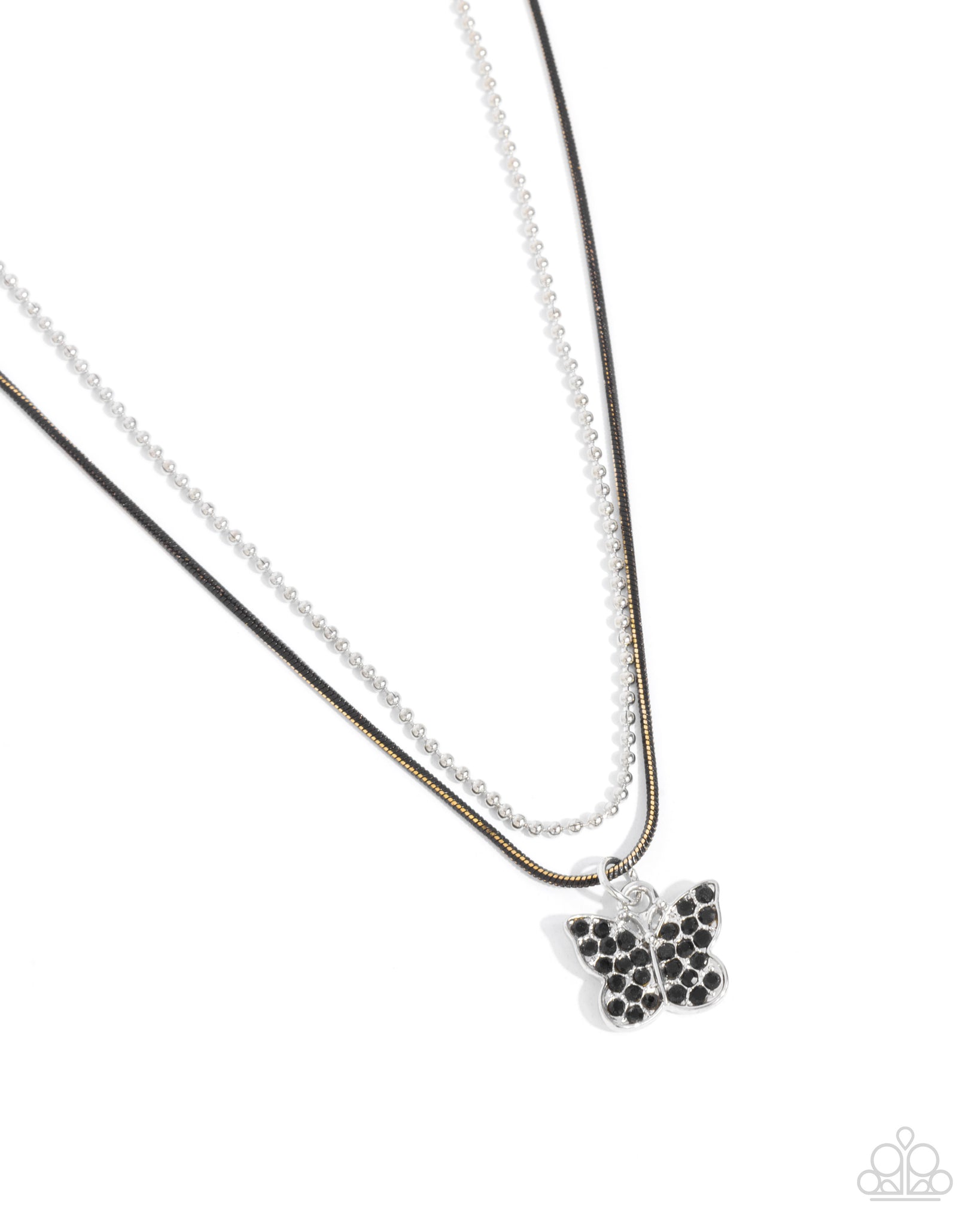 Embellished atop a glistening silver butterfly, jet-black rhinestones shimmer below the neckline from a snake chain, layering with a silver ball chain for a fashionable flutter. Features an adjustable clasp closure.