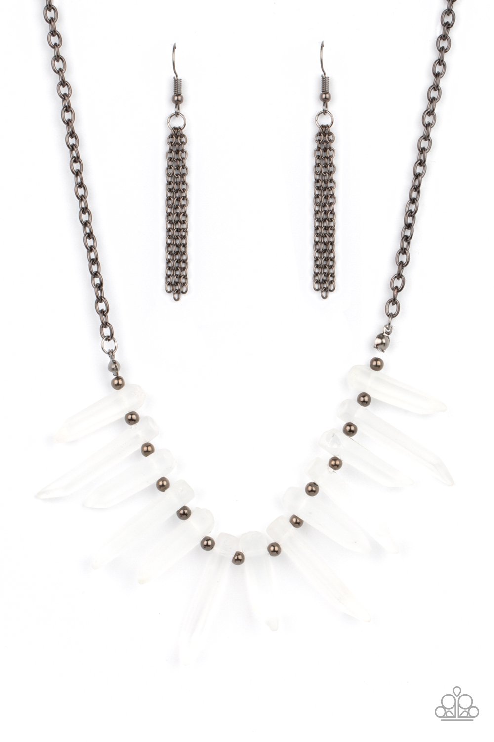 Separated by dainty gunmetal beads, an opaque collection of glassy-like icicle beads fans out below the collar, creating an icy fringe. Features an adjustable clasp closure.