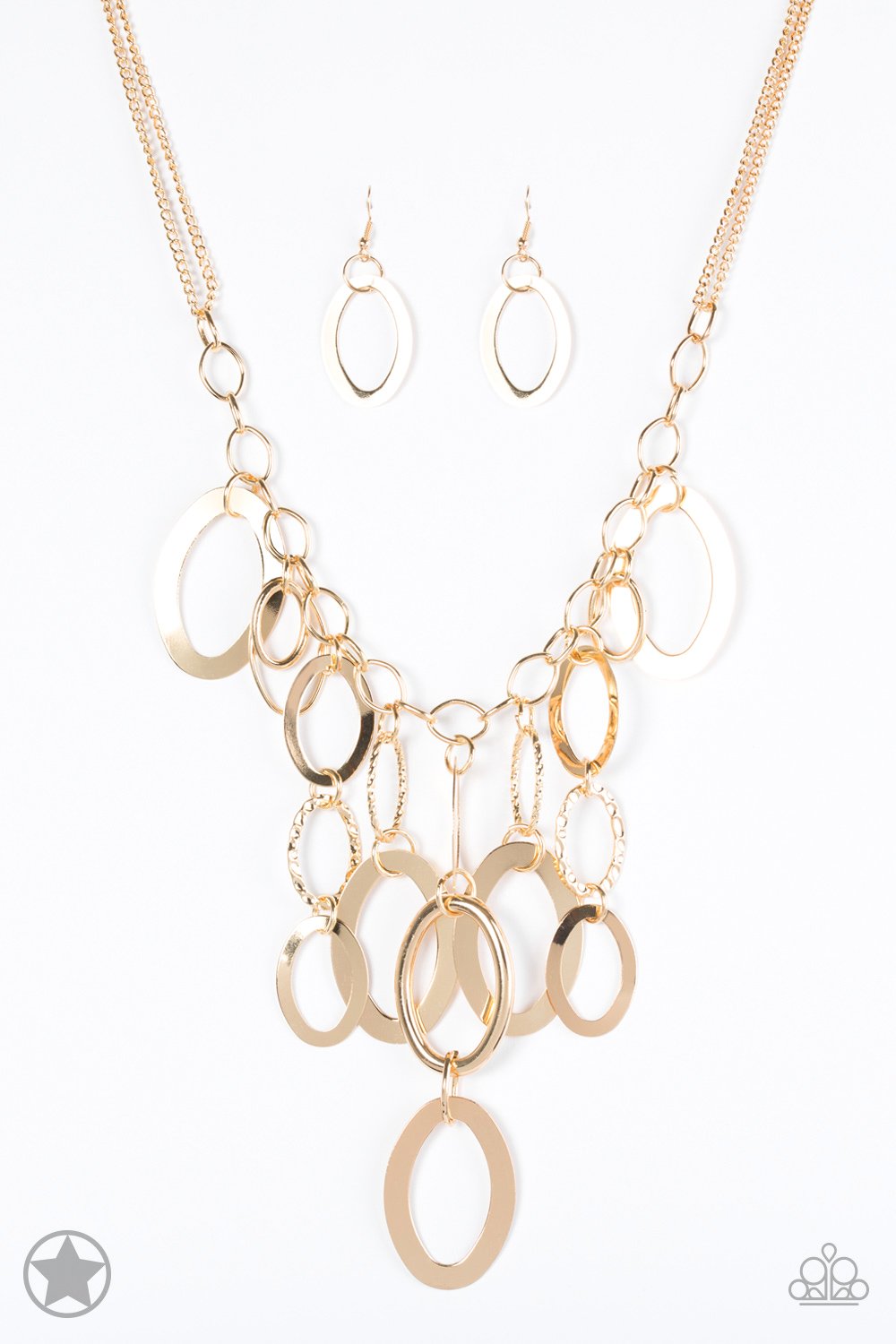 Large gold links and shimmering textured gold rings cascade below a gold chain freely, allowing for movement that makes a bold statement. Features an adjustable clasp closure.