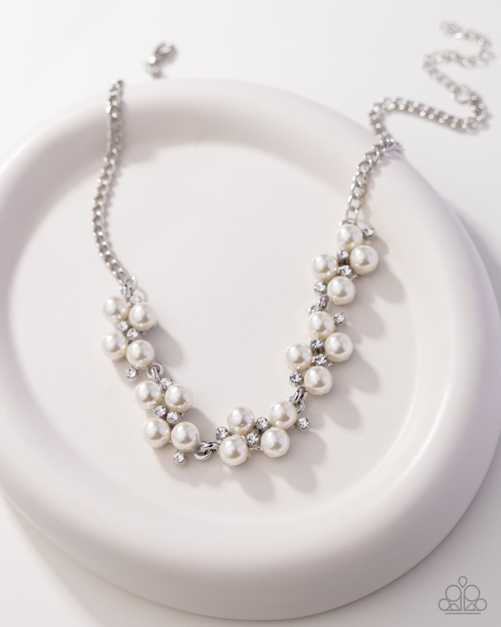 Dainty clusters of shimmery white pearls are dusted with sparkling rhinestones, creating a romantic, timeless design. Features an adjustable clasp closure.