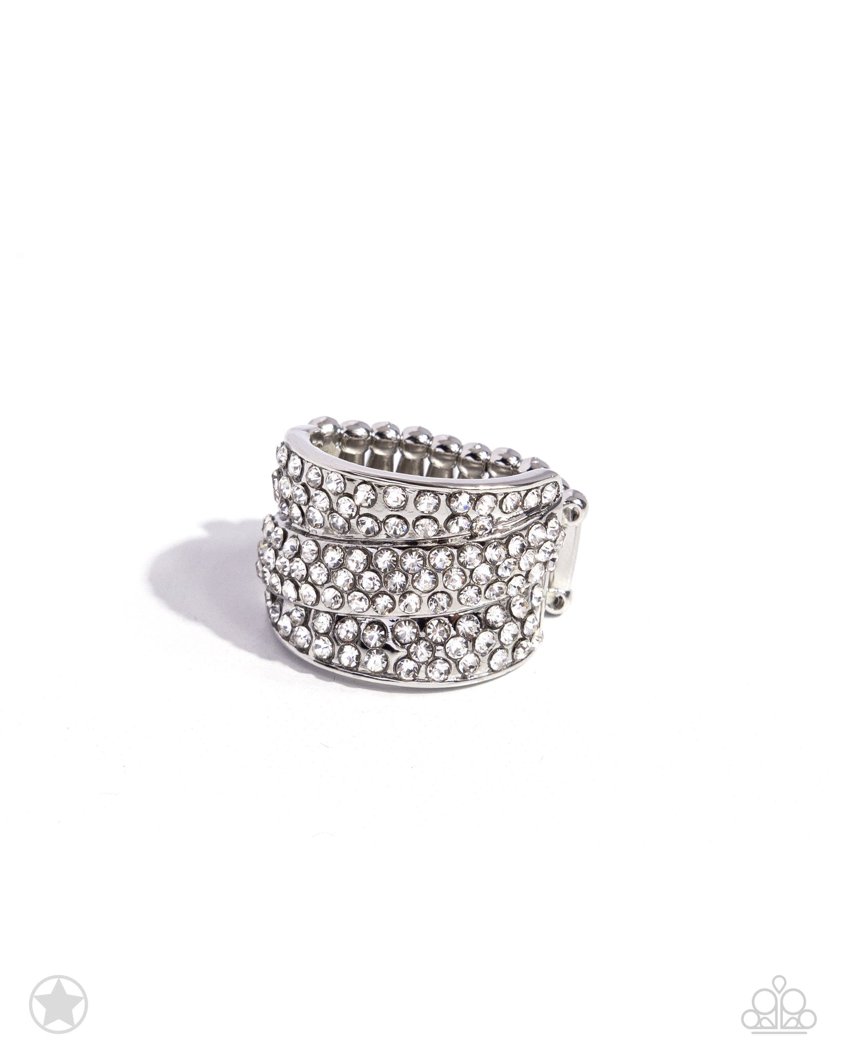 Row upon row of glistening white rhinestones stack into an incandescent display. An additional row of sparkling rhinestones wraps diagonally across the band for an extra splash of refined shimmer.