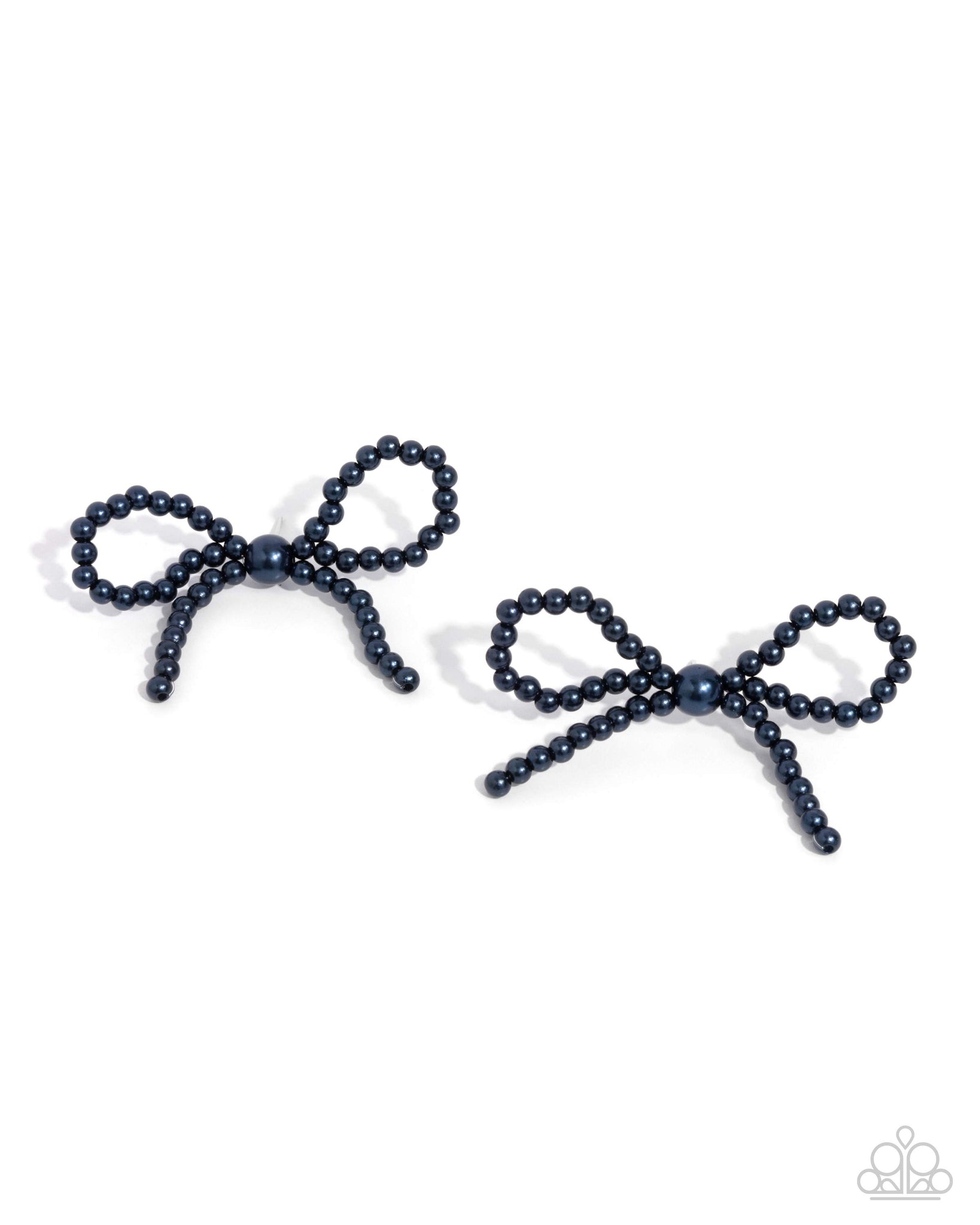High-sheen dainty blue pearls loop and curl into an elegant, classic bow from an oversized blue pearl on silver wire for a refined centerpiece. Earring attaches to a standard post fitting.