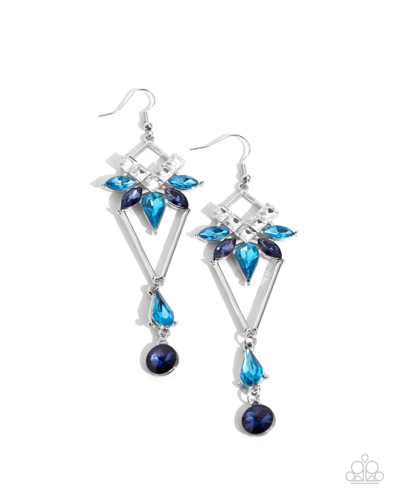 White square-cut gems embellish the bottom angle of a dainty silver diamond frame. Marquise-cut and teardrop navy and blue gems bloom from the diamond frame. Sharp v-shaped silver bars give way to a linked, pronged blue teardrop and navy round gem for a smoldering, jaw-dropping lure. Earring attaches to a standard fishhook fitting.