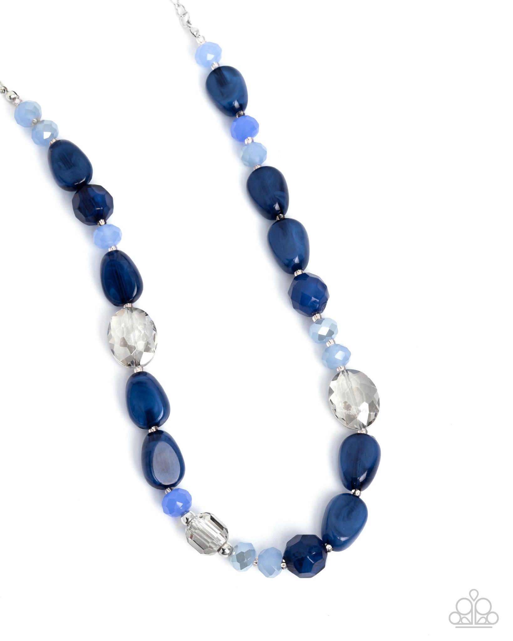 Infused along an invisible string, a collection of silver beads and accents, faceted blue beads, Deja Vu Blue beads in varying opacities and cuts, light blue faceted beads, transparent gray ovals, and a transparent gray faceted bead pattern below the neckline for a whimsical pop of color. Features an adjustable clasp closure.