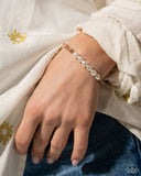 Infused along an elastic stretchy band a collection of ivory seed beads, white pearls, gold beads, and pink and white stones coalesce around the wrist. Marbled Brush stones are added along the design for additional color and wild interest. As the stone elements in this piece are natural, some color variation is normal.