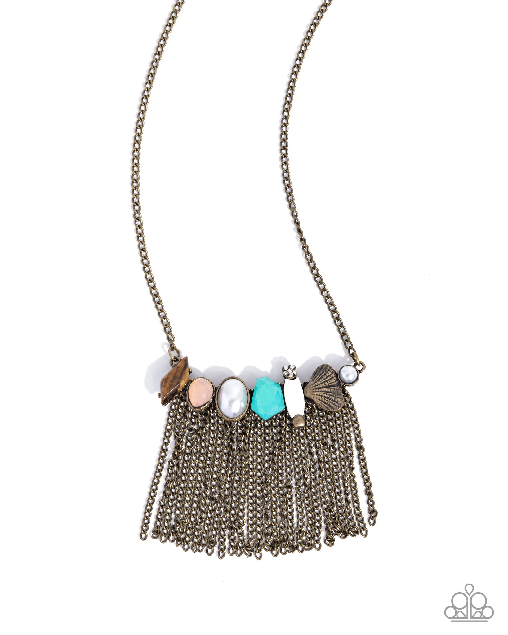 Infused with a row of eclectic materials including a chiseled tiger's eye stone, round and oval white pearls in brass frames, a tilted textured brass seashell, a Desert Flower milky teardrop, a defaced Capri Blue acrylic, and a chiseled white cylindrical shell framed by a white rhinestone flower and brass fitting, mismatched strands of classic brass chains stream from the bottom of a glistening brass chain, creating a statement-making fringe below the collar. Features an adjustable clasp closure. As the stone elements in this piece are natural, some color variation is normal.