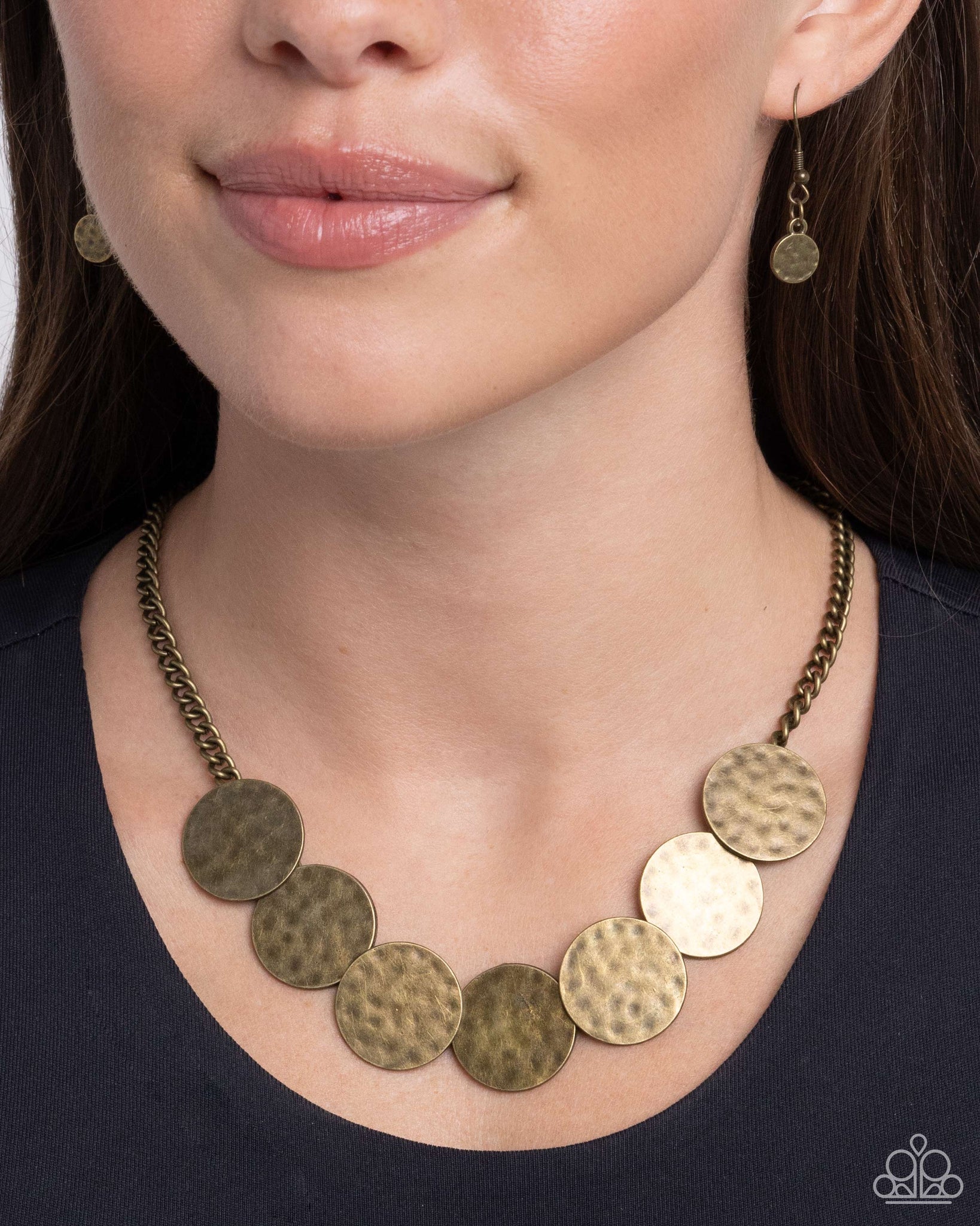 Brushed in a rustic finish, a row of hammered brass discs delicately overlap as they link below the collar for a gritty edge. Features an adjustable clasp closure.