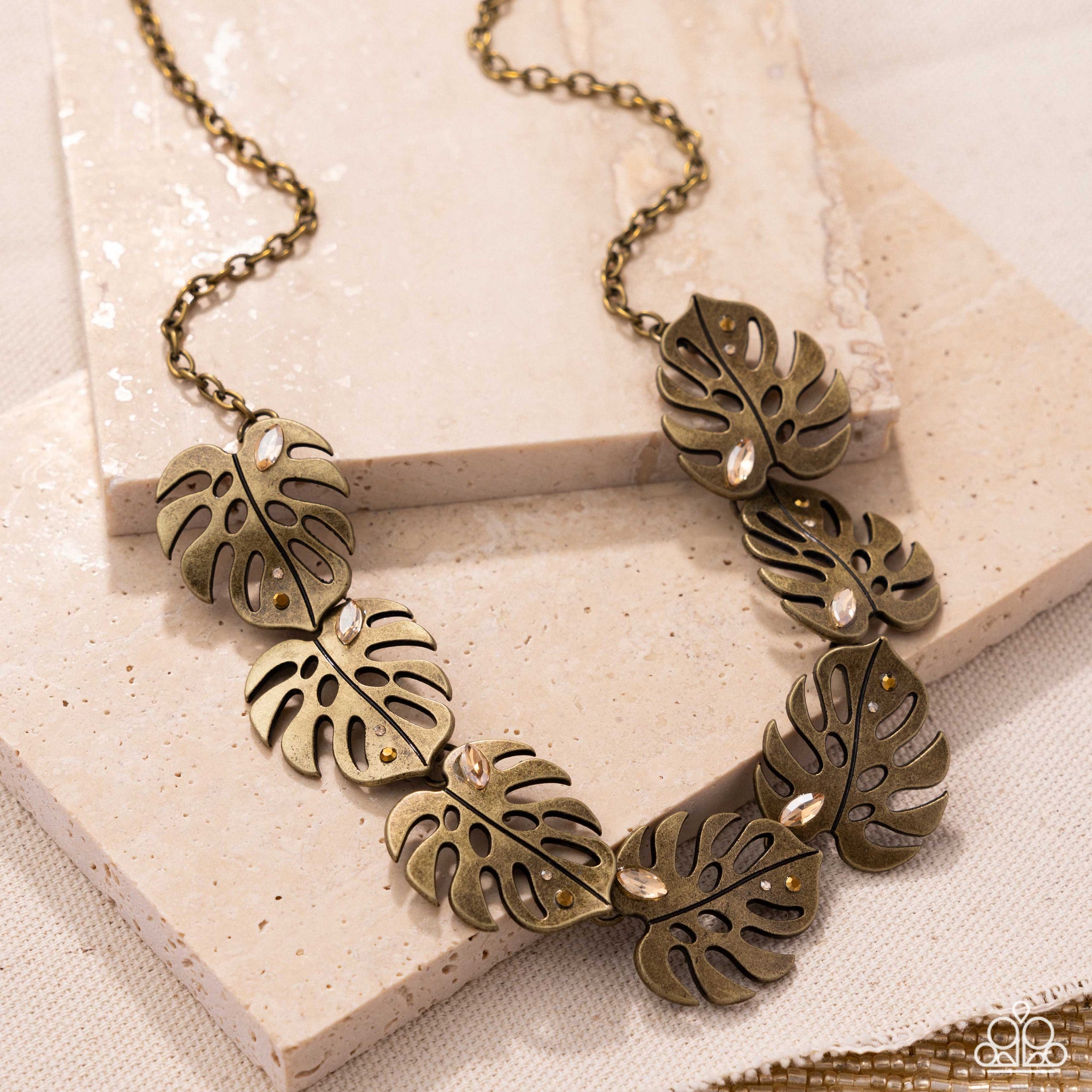 Brushed in an antiqued brass finish, a collection of airy leaf frames creates a tropical-inspired design. Dainty rhinestones are nestled within the open leaves, adding a touch of shimmer to the bold metallic display. Features an adjustable clasp closure.