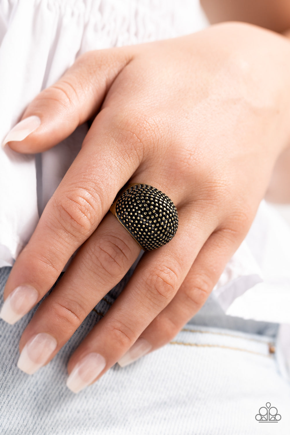 Dotting the surface of an extended brass frame, dainty brass studs seemingly pop off the finger, reflecting light off its every surface for an industrial finish. Features a stretchy band for a flexible fit.