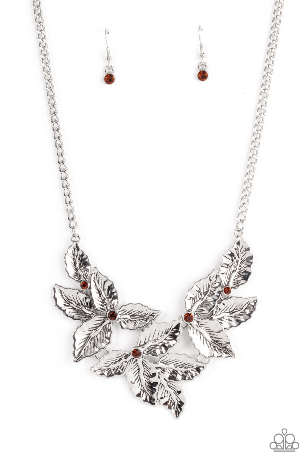 A textured collection of silver holly-like leaves are dotted with dainty topaz rhinestones as they bloom below the collar, invoking a festive spirit. Features an adjustable clasp closure.