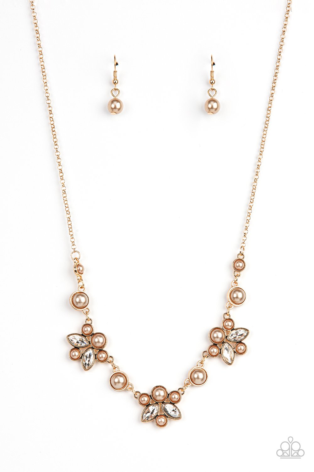Infused with solitaire pearls, dainty clusters of bubbly champagne colored pearls and glassy white marquise style rhinestones delicately gather into clustered frames below the collar for an elegantly timeless finish. Features an adjustable clasp closure.